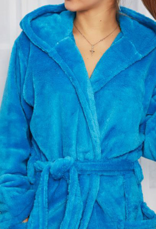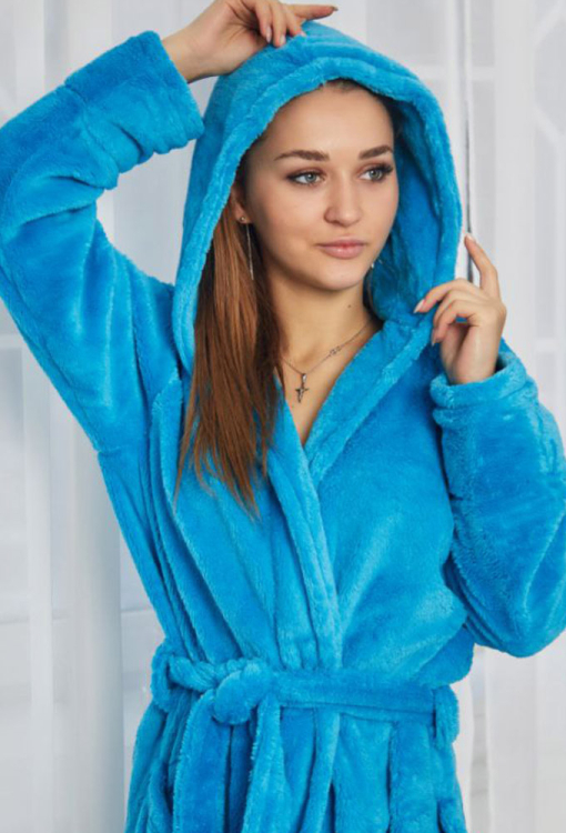 Теплый и приятный к телу женский халат от украинского бренда Tomiko. Халат выполнен из мягкого и качественного велсофта бирюзового цвета, свободного силуэта и длиной ниже колен. Модель с длинными рукавами, двойным капюшоном и удобными накладными карманами, завязывается на запах с помощью пояса, длина рукава регулируется с помощью отложных манжет. Халат красивый и очень комфортный, обеспечит тепло и уют в холодное время года, также может быть прекрасным подарком любимому и близкому человеку!