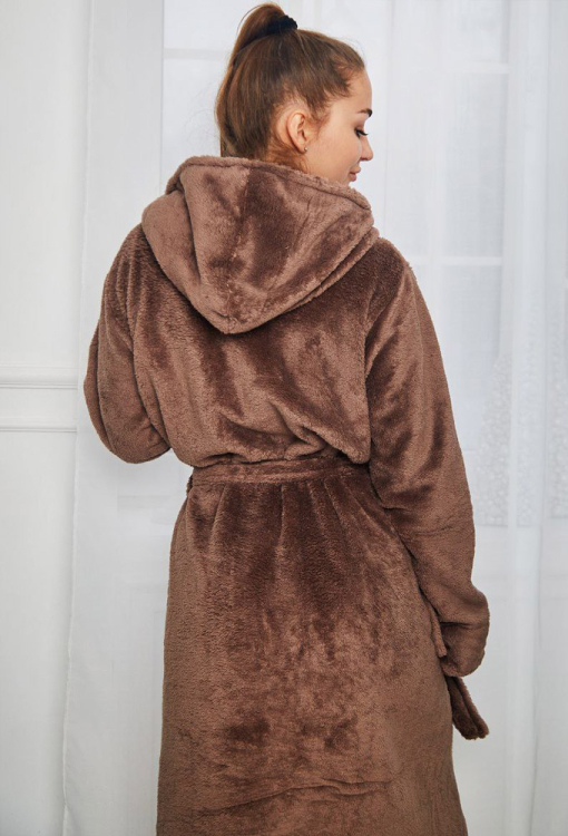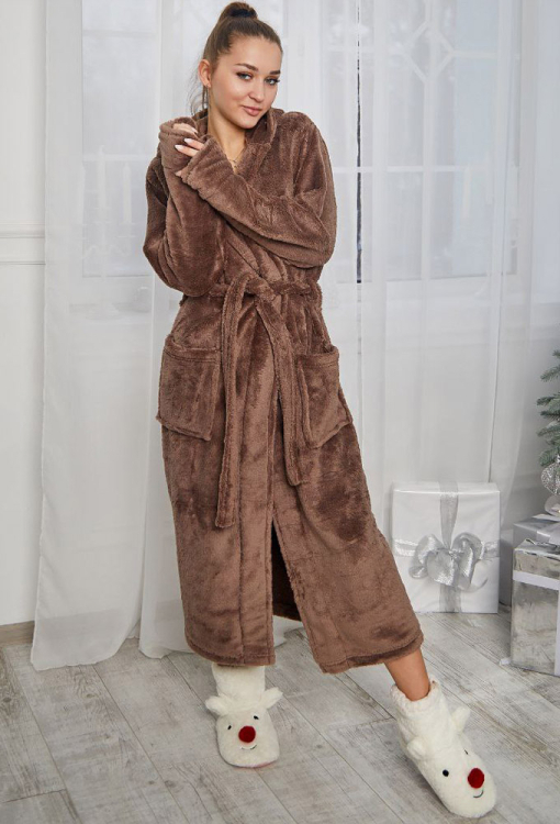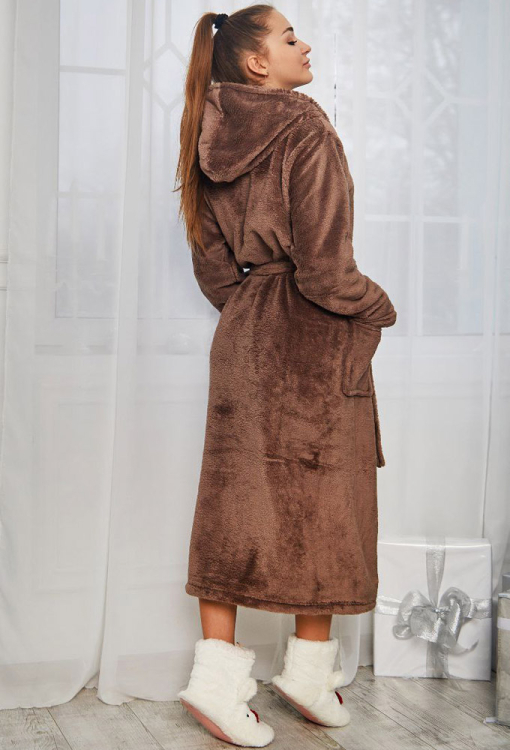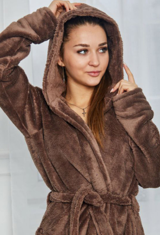 Теплый и приятный к телу женский халат от украинского бренда Tomiko. Халат выполнен из мягкого и качественного велсофта коричневого цвета, свободного силуэта и длиной ниже колен. Модель с длинными рукавами, двойным капюшоном и удобными накладными карманами, завязывается на запах с помощью пояса, длина рукава регулируется с помощью отложных манжет. Халат красивый и очень комфортный, согреет в холодное время года, также может быть прекрасным подарком любимому и близкому человеку!