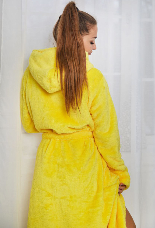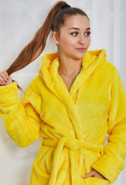 Яркий и невероятно теплый женский халат от украинского бренда Tomiko. Халат выполнен из мягкого и качественного велсофта желтого цвета, свободного силуэта и длиной ниже колен. Модель с длинными рукавами, двойным капюшоном и удобными накладными карманами, завязывается на запах с помощью пояса, длина рукава регулируется с помощью отложных манжет. Халат красивый и очень комфортный, обеспечит тепло и уют в холодное время года, также может быть прекрасным подарком любимому и близкому человеку!