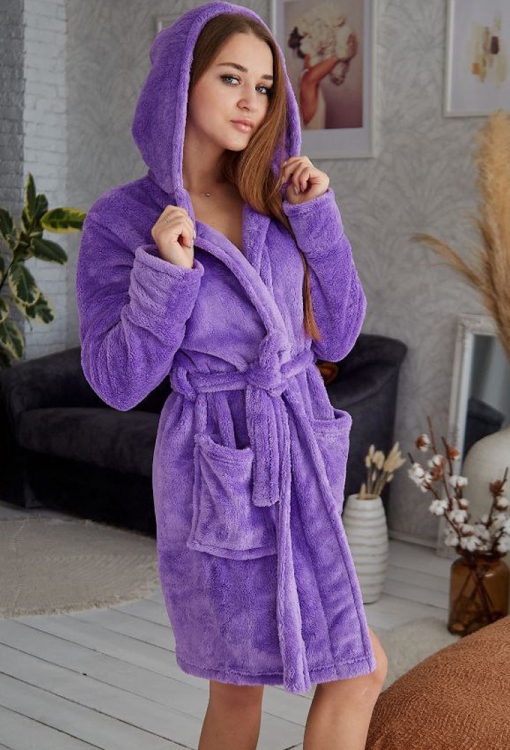 Нежный теплый женский халат от украинского бренда Tomiko. Халат выполнен из мягкого и качественного велсофта сиреневого цвета, свободного силуэта и длиной выше колен. Модель с длинными рукавами, двойным капюшоном и удобными накладными карманами, завязывается на запах с помощью пояса, длина рукава регулируется за счет отложных манжет. Халат стильный очень комфортный, согреет в холодное время года, также может быть прекрасным подарком любимому и близкому человеку!