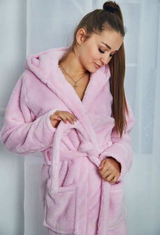 Невероятно теплый женский халат от украинского бренда Tomiko. Халат выполнен из мягкого и качественного велсофта пудрового цвета, свободного силуэта и длиной выше колен. Модель с длинными рукавами, двойным капюшоном и удобными накладными карманами, завязывается на запах с помощью пояса, длина рукава регулируется за счет отложных манжет. Халат стильный очень комфортный, согреет в холодное время года, также может быть прекрасным подарком любимому и близкому человеку!
