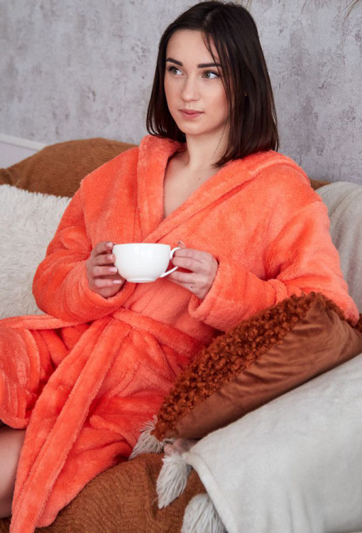 Яркий и невероятно теплый женский халат от украинского бренда Tomiko. Халат выполнен из мягкого и качественного велсофта персикового цвета, свободного силуэта и длиной выше колен. Модель с длинными рукавами, двойным капюшоном и удобными накладными карманами, завязывается на запах с помощью пояса, длина рукава регулируется за счет отложных манжет. Халат стильный очень комфортный, согреет в холодное время года, также может быть прекрасным подарком любимому и близкому человеку!
