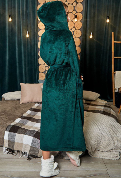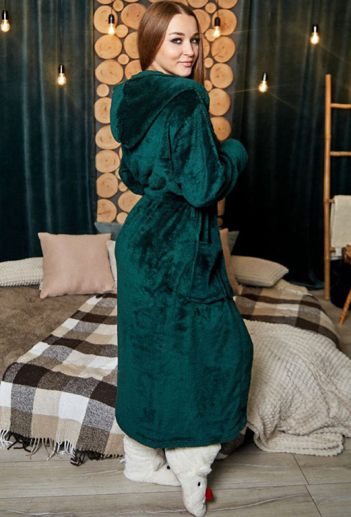 Роскошный женский халат от украинского бренда Tomiko. Халат выполнен из мягкого и качественного велсофта изумрудного цвета, свободного силуэта и длиной ниже колен. Модель с длинными рукавами, двойным капюшоном и удобными накладными карманами, завязывается на запах с помощью пояса, длина рукава регулируется с помощью отложных манжет. Халат красивый и очень комфортный, согреет в холодное время года, также может быть прекрасным подарком любимому и близкому человеку!