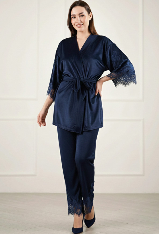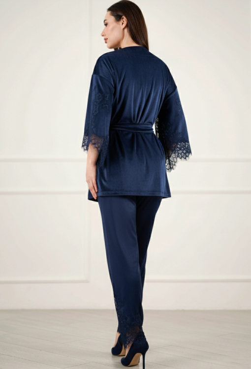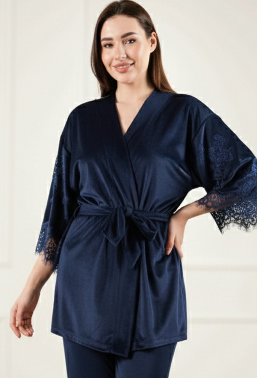 Стильный женский халат из коллекции Abu Dhabi от украинского бренда Komilfo. Халат выполнен из мягкого и качественного велюра на хлопковой основе темно-синего цвета, свободного кроя и длиной мини. Модель с рукавами 3/4, завязывается на запах с помощью пояса. Рукава изделия украшены вырезными вставками из ажурного кружева. Халат очень красивый и комфортный, упакованный в фирменную коробку подойдет для подарка близким людям!