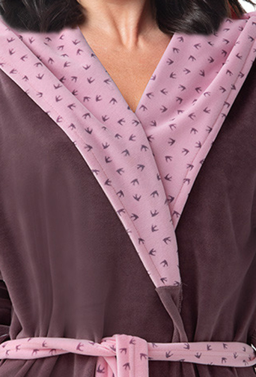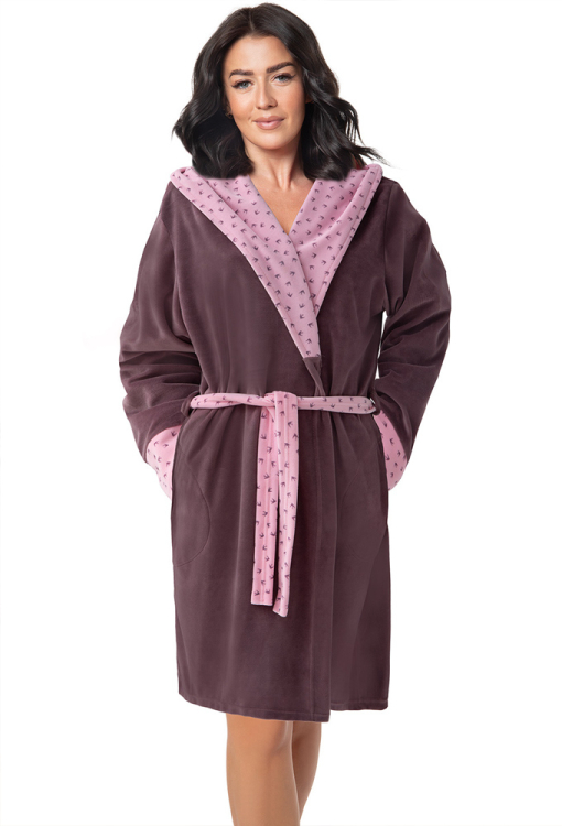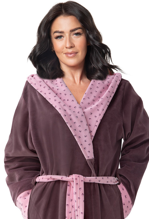Удобный женский халат от польского бренда Dorota. Халат выполнен из мягкого и качественного велюра темно-сливового цвета, с длинными рукавами и капюшоном. Модель длиной выше колен и с удобными боковыми карманами, завязывается на запах с помощью пояса, внутренняя сторона капюшона, манжеты на рукавах и пояс выполнены из велюра сиреневого цвета в мелкий принт в виде ласточек. Халат очень красивый и комфортный, подойдет как для купания, так и для домашнего уюта, а также может быть отличным подарком любимому или близкому человеку.