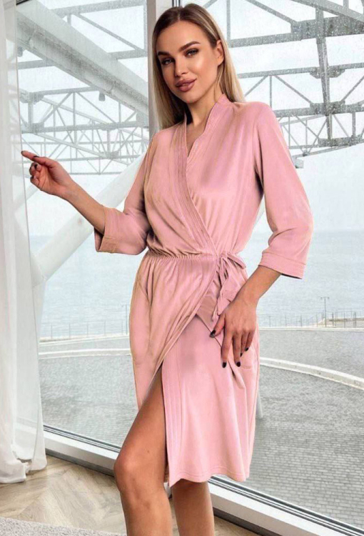 Элегантный женский халат от украинского бренда Julia Ulich. Халат выполнен из мягкого и качественного велюра розового цвета, свободного силуэта и длиной выше колен. Модель с рукавами 3/4 длины и удобными боковыми карманами, завязывается на запах с помощью тонкого внутреннего пояса, вырез, полки и рукава украшены рельефными линиями. Халат очень красивый и комфортный, обеспечит тепло и уют в любое время года, также может быть прекрасным подарком любимому и близкому человеку!