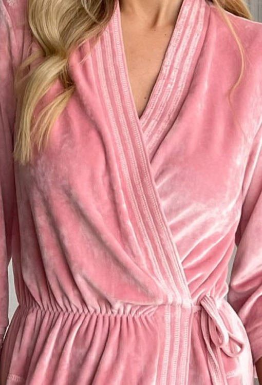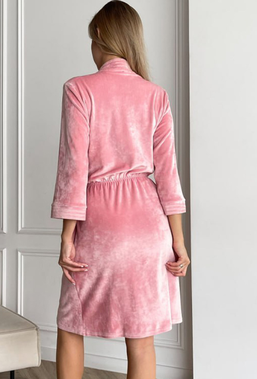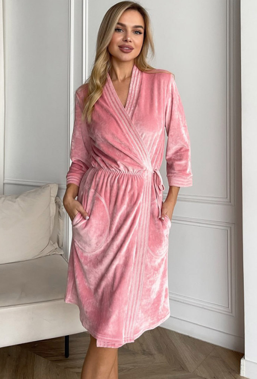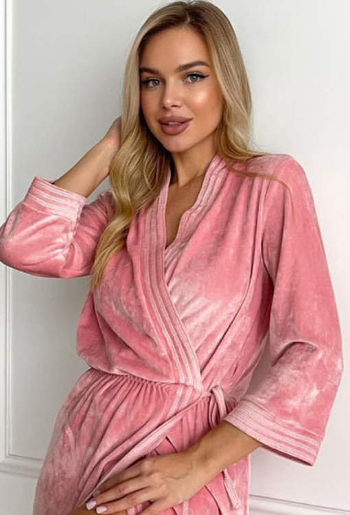Элегантный женский халат от украинского бренда Julia Ulich. Халат выполнен из мягкого и качественного велюра светло-розового цвета, свободного силуэта и длиной выше колен. Модель с рукавами 3/4 длины и удобными боковыми карманами, завязывается на запах с помощью тонкого внутреннего пояса, вырез, полки и рукава украшены рельефными линиями. Халат очень красивый и комфортный, обеспечит тепло и уют в любое время года, также может быть прекрасным подарком любимому и близкому человеку!
