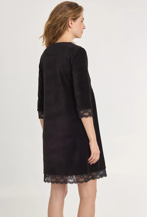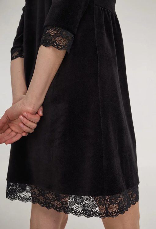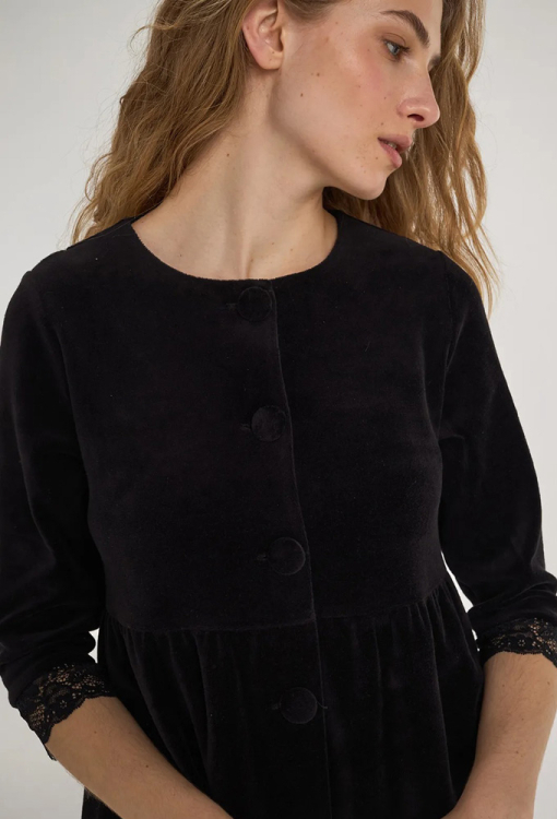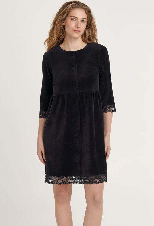 Очаровательный женский халат из коллекции Margo от украинского бренда Ellen. Халат выполнен из качественного и мягкого велюра черного цвета, длиной выше колен и с рукавами 3/4. Модель с круглым вырезом горла, застегивается на пуговицы, полка обработана отрезной линией и мягкими складками, спинка прямого силуэта, рукава и низ украшены вставками из ажурного кружева. Халат очень красивый и комфортный, идеален для домашнего пользования, также может быть замечательным подарком любимому или близкому человеку.