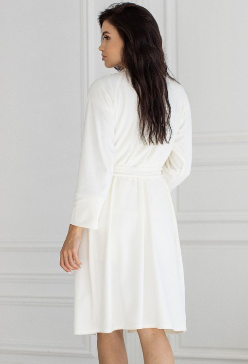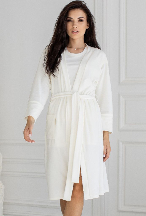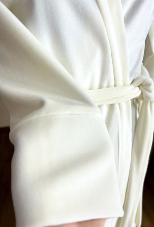 Нежный женский халат от украинского бренда MiaNaGreen. Халат выполнен из высококачественного и мягкого велюра кремового цвета, свободного силуэта и длиной немного выше колен. Модель с длинными рукавами и удобным накладным карманом, завязывается на запах с помощью пояса. Халат теплый и очень комфортный, идеален для домашнего уюта в холодную пору, а также может быть отличным подарком любимому или близкому человеку.