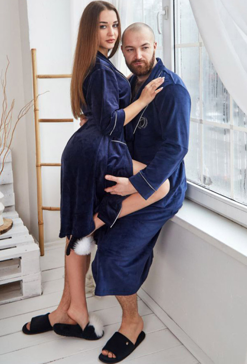 Привлекательный женский халат от украинского бренда Tomiko. Халат выполнен из мягкого и качественного велюра темно-синего цвета, свободного силуэта, с шалевым воротником и длиной немного ниже колен. Модель с рукавами 3/4 и двумя накладными карманами, завязывается на запах с помощью пояса. Воротник, борта, рукава и карманы изделия украшены тонким кантом белого цвета. Халат очень красивый и комфортный, идеальный вариант для утреннего кофе и вечернего релакса, также подойдет в качестве подарка любимому и близкому человеку!