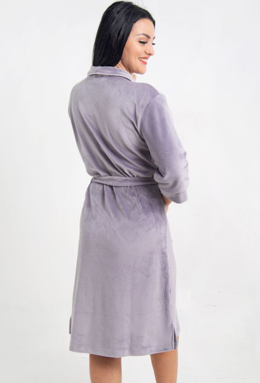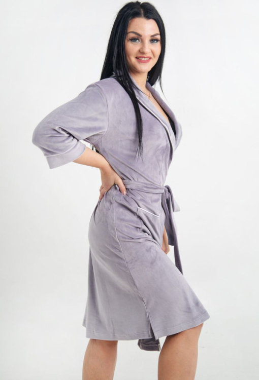 Красивый женский халат от украинского бренда Tomiko. Халат выполнен из мягкого и качественного велюра серого цвета, свободного силуэта, с шалевым воротником и длиной немного ниже колен. Модель с рукавами 3/4, двумя накладными карманами и небольшими боковыми разрезами, завязывается на запах с помощью пояса. Воротник, борта, рукава и карманы изделия украшены тонким кантом белого цвета. Халат стильный и очень комфортный, идеальный вариант для утреннего кофе и вечернего релакса, также подойдет в качестве подарка любимому и близкому человеку!
