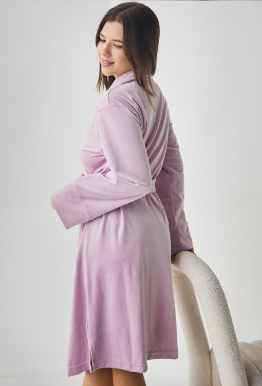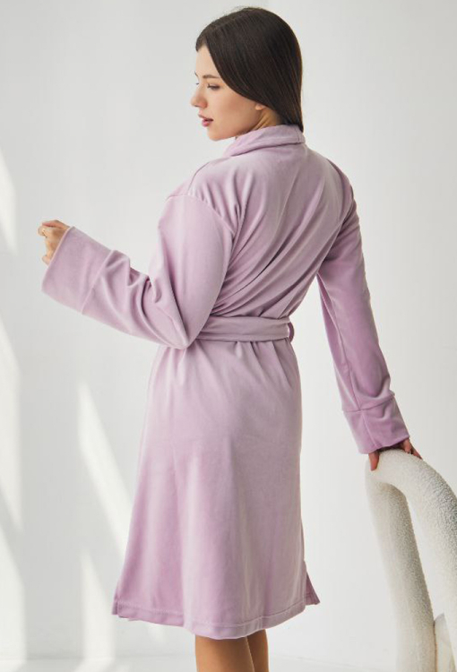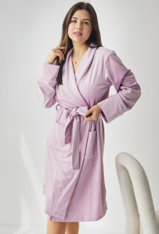 Комфортный женский халат от украинского бренда Tomiko. Халат выполнен из мягкого и качественного велюра цвета розовая пудра, свободного силуэта и длиной немного ниже колен. Модель с длинными рукавами, воротником шаль и двумя накладными карманами, завязывается на запах с помощью пояса и завязок внутри. Рукава изделия обработаны свободными манжетами, боковые линии внизу - небольшими разрезами. Халат очень красивый и удобный, идеальный вариант для утреннего кофе и вечернего релакса, также подойдет в качестве подарка любимому и близкому человеку!