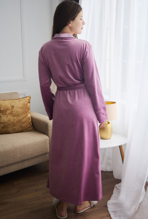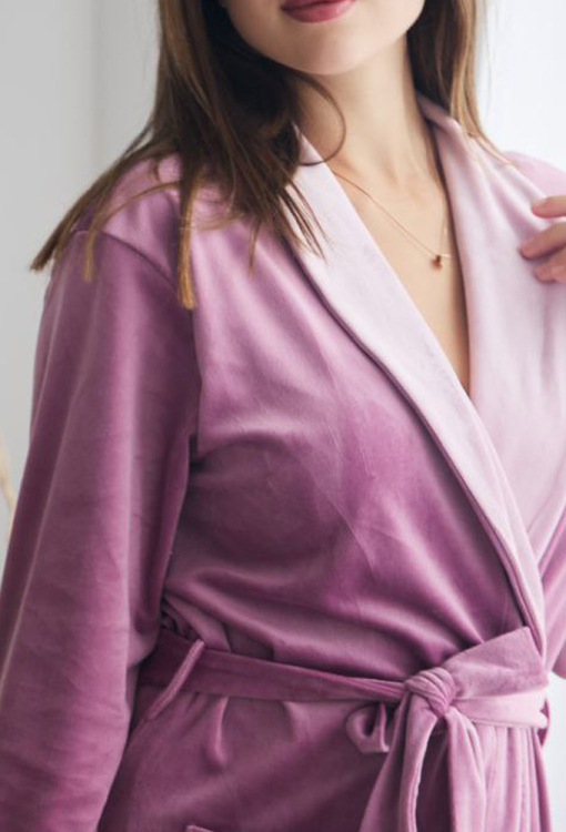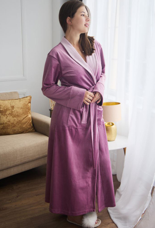 Роскошный женский халат от украинского бренда Tomiko. Халат выполнен из мягкого и качественного велюра темно-розового цвета, свободного силуэта, с пудровым шалевым воротником и длиной в пол. Модель с длинными рукавами и удобными накладными карманами, завязывается на запах с помощью пояса и внутренних завязок, рукава обработаны свободными манжетами. Халат красивый и очень комфортный, обеспечит тепло и уют в любое время года, также может быть прекрасным подарком любимому и близкому человеку!