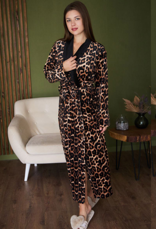 Роскошный женский халат от украинского бренда Tomiko. Халат выполнен из мягкого и качественного велюра, бежевого цвета коричневый в черный леопардовый принт, свободного силуэта, с черным шалевым воротником и длиной в пол. Модель с длинными рукавами и удобными накладными карманами, завязывается на запах с помощью пояса и внутренних завязок, рукава обработаны свободными манжетами. Халат красивый и очень комфортный, обеспечит тепло и уют в любое время года, также может быть прекрасным подарком любимому и близкому человеку!