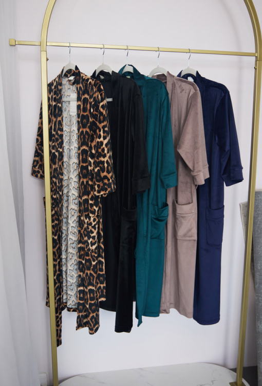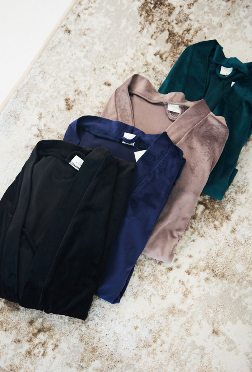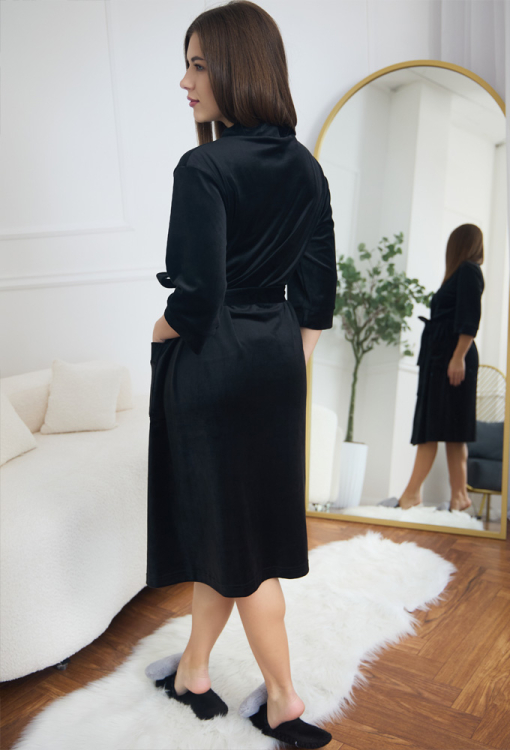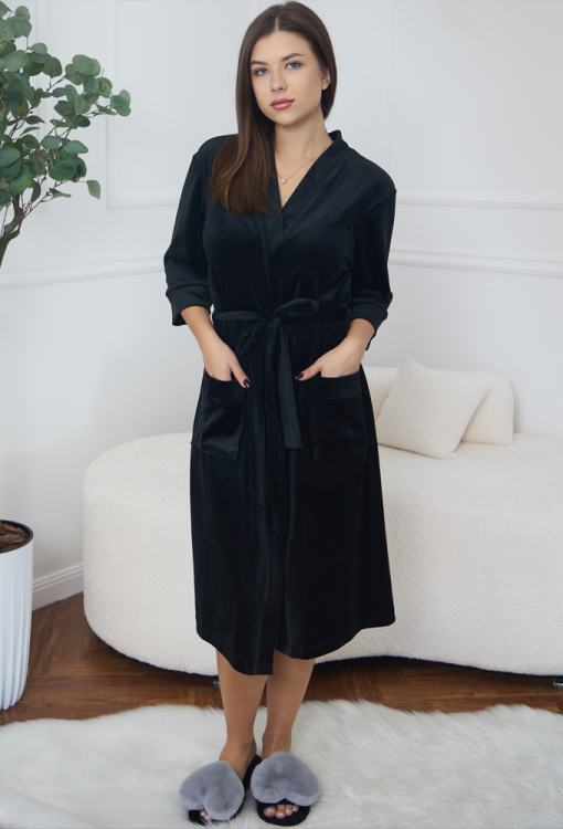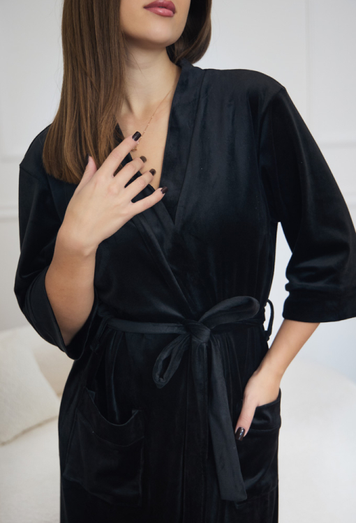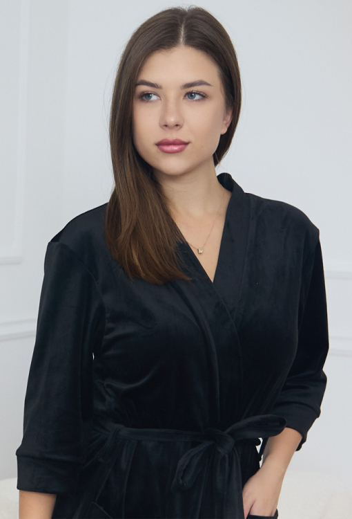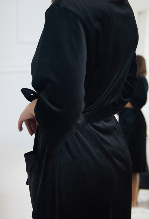 Стильный женский халат от украинского бренда Tomiko. Халат выполнен из мягкого и качественного велюра черного цвета, свободного силуэта и длиной немного ниже колен. Модель с рукавами 3/4 и двумя накладными карманами, завязывается на запах с помощью пояса. Рукава изделия обработаны свободными манжетами. Халат очень красивый и комфортный, идеальный вариант для спа, утреннего кофе и вечернего отдыха дома, также может быть замечательным и полезным подарком любимому и близкому человеку!