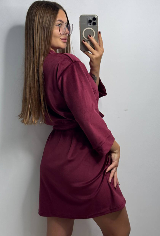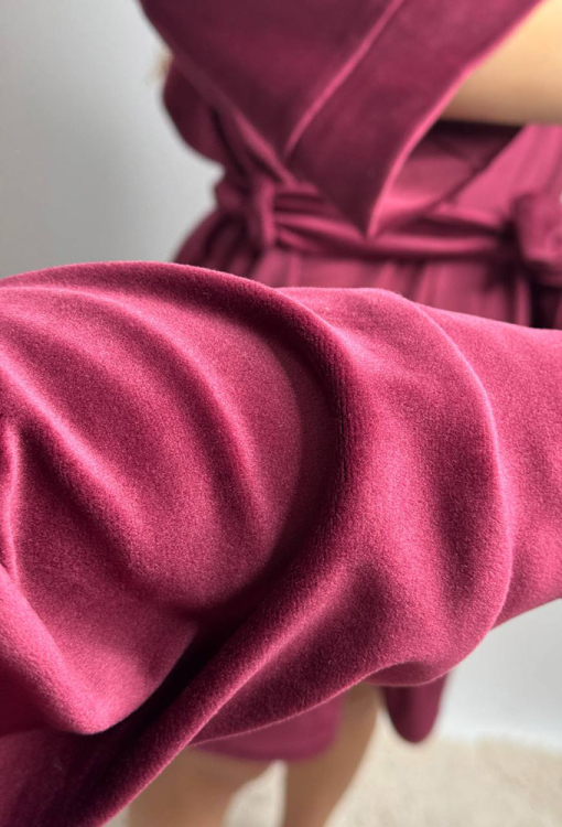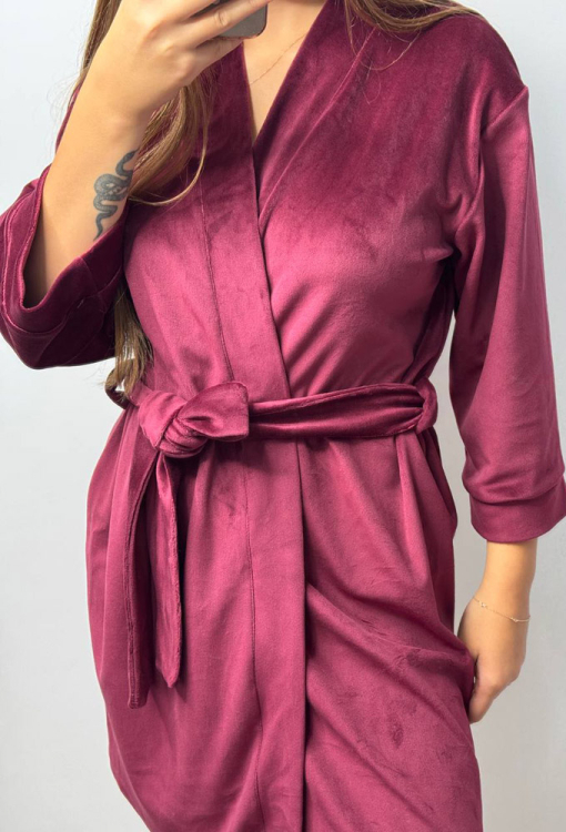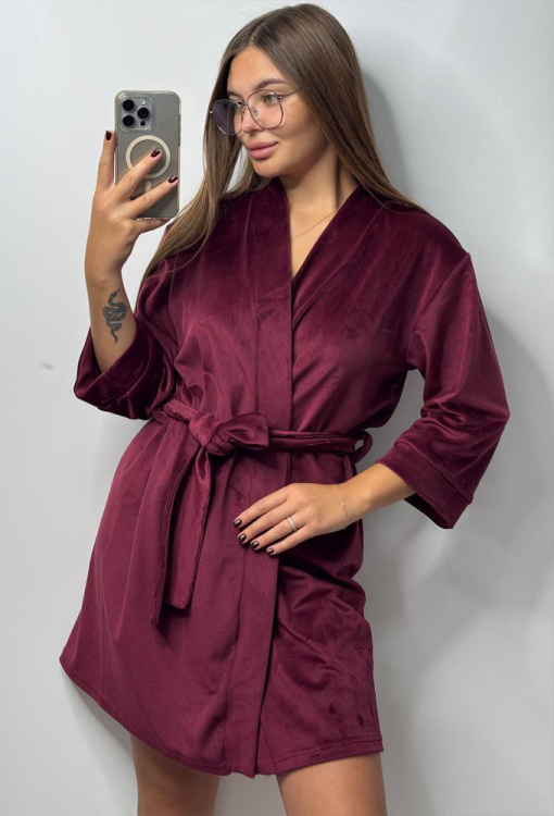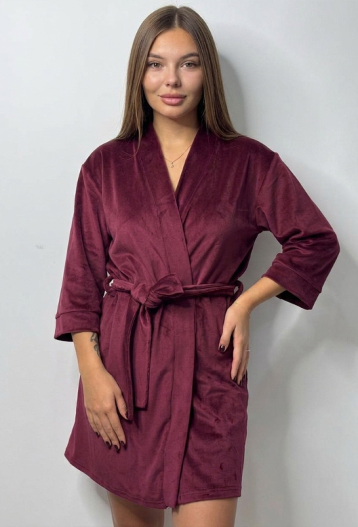 Красивый женский халат от украинского бренда V.Velika. Халат выполнен из мягкого и качественного велюра бюрдового цвета, свободного силуэта и длиной выше колен. Модель с рукавами 3/4 завязывается на запах с помощью пояса, рукава обработаны свободными манжетами. Внутри изделие обработано завязками для удобной посадки, снаружи по бокам - петлями для фиксации пояса. Халат легкий и приятный к телу, подчеркнет привлекательность домашнего образа, также может быть замечательным подарком для любимого и близкого человека.
