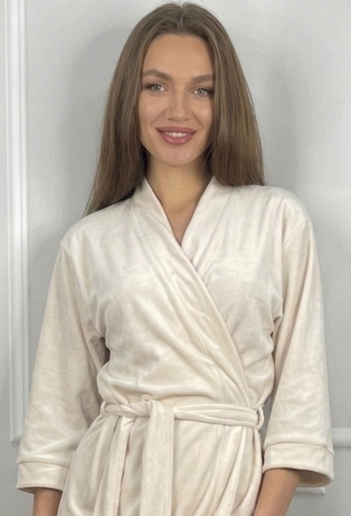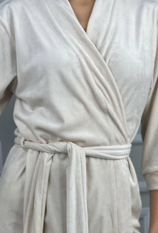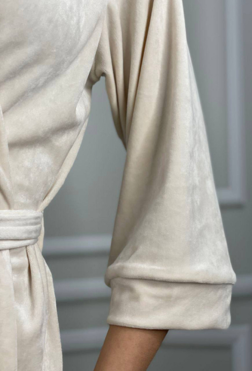 Стильный женский халат от украинского бренда V.Velika. Халат выполнен из мягкого и качественного велюра кремового цвета, свободного силуэта и длиной выше колен. Модель с рукавами 3/4 завязывается на запах с помощью пояса, рукава обработаны свободными манжетами. Внутри изделие обработано завязками для удобной посадки, снаружи по бокам - петлями для фиксации пояса. Халат легкий и приятный к телу, подчеркнет привлекательность домашнего образа, также может быть замечательным подарком для любимого и близкого человека.