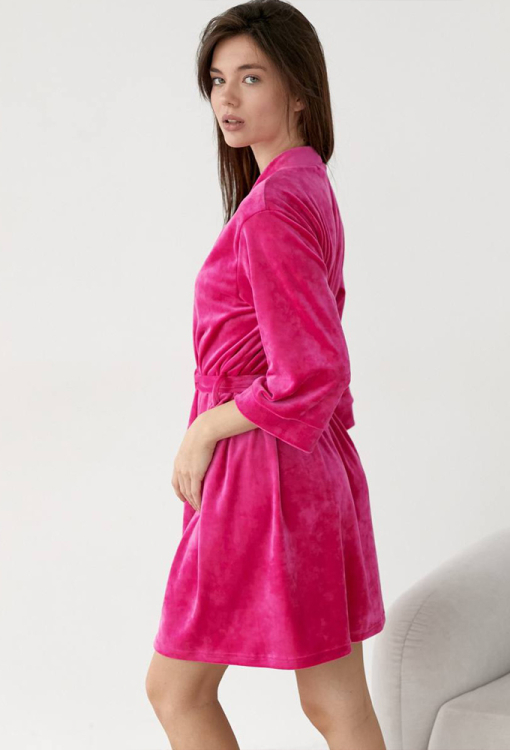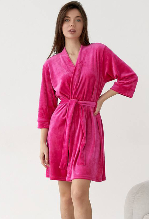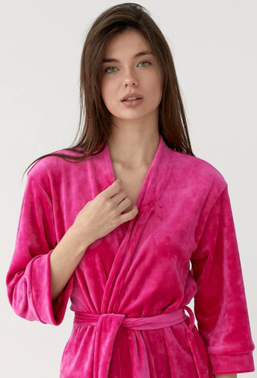 Яркий женский халат от украинского бренда V.Velika. Халат выполнен из мягкого и качественного велюра малинового цвета, свободного силуэта и длиной выше колен. Модель с рукавами 3/4 завязывается на запах с помощью пояса, рукава обработаны свободными манжетами. Внутри изделие обработано завязками для удобной посадки, снаружи по бокам - петлями для фиксации пояса. Халат легкий и приятный к телу, подчеркнет привлекательность домашнего образа, также может быть замечательным подарком для любимого и близкого человека.