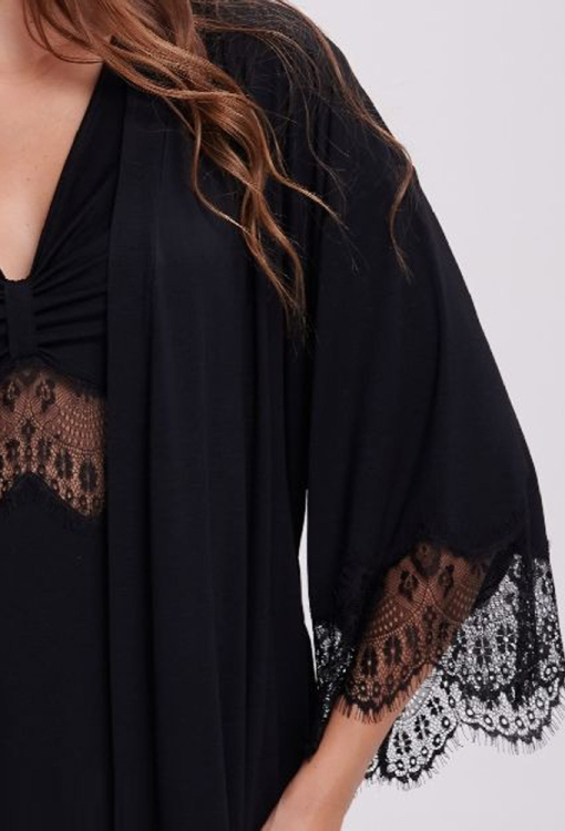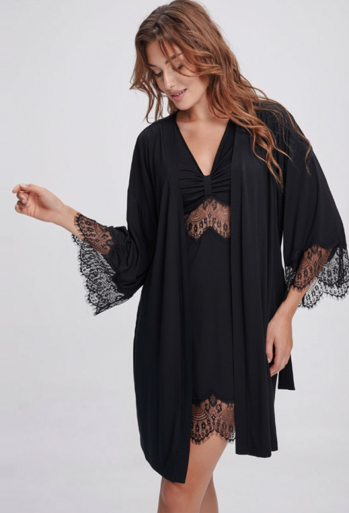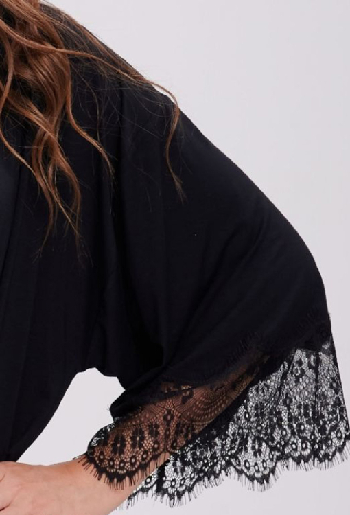 Роскошный женский халат от украинского бренда Shato - изысканное сочетание элегантности, женственности и уюта. Халат выполнен из качественной, мягкой и приятной к телу вискозы черного цвета, классического кроя и с широкими рукавами 3/4. Длина выше колен подчёркивает стройность силуэта, а запах с поясом позволяет легко регулировать посадку и акцентировать талию. Рукава модели украшены изящными вставками из нежного ажурного кружева с волнистым краем и утонченными «ресничками», придающими образу особый шарм и благородство. Халат невероятно красивый и комфортный, идеально подходит для домашнего отдыха и станет прекрасным подарком для любимого или близкого человека.
