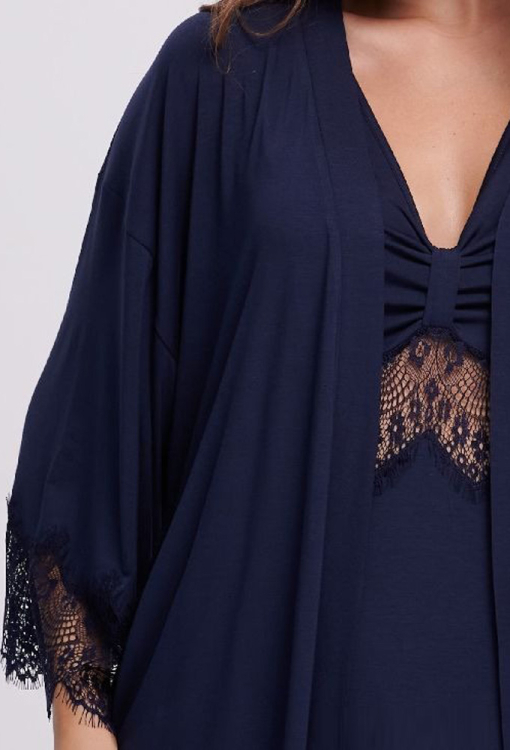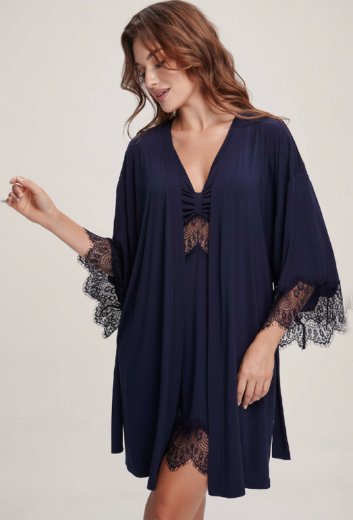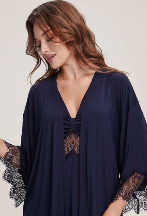 Роскошный женский халат от украинского бренда Shato - изысканное сочетание элегантности, женственности и уюта. Халат выполнен из качественной, мягкой и приятной к телу вискозы темно-синего цвета, классического кроя и с широкими рукавами 3/4. Длина выше колен подчёркивает стройность силуэта, а запах с поясом позволяет легко регулировать посадку и акцентировать талию. Рукава модели украшены изящными вставками из нежного ажурного кружева с волнистым краем и утонченными «ресничками», придающими образу особый шарм и благородство. Халат невероятно красивый и комфортный, идеально подходит для домашнего отдыха и станет прекрасным подарком для любимого или близкого человека.