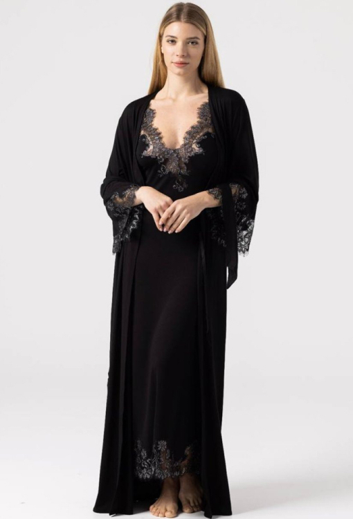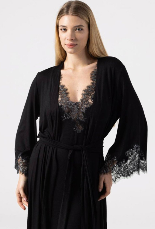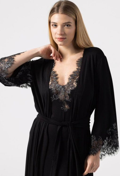 Элегантный женский халат из коллекции Silver Black от украинского бренда Felena. Халат выполнен из мягкой и качественной вискозы с модалом, черного цвета, свободного силуэта и с длинными расширенными рукавами. Модель длиной в пол, завязывается на запах с помощью пояса, рукава изделия украшены вырезными вставками из шикарного ажурного кружева серебристого цвета. Халат очень красивый и комфортный, подчеркнет женственность домашнего образа, а также может быть прекрасным подарком любимому и близкому человеку.