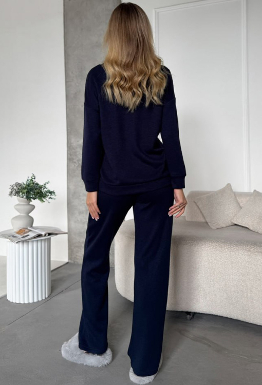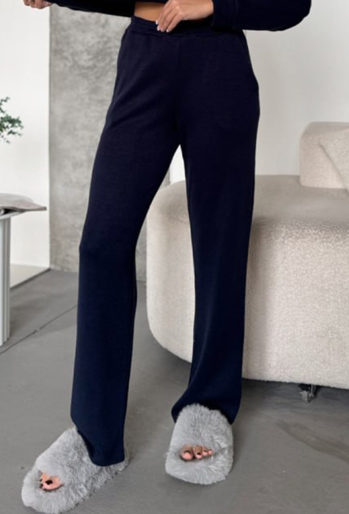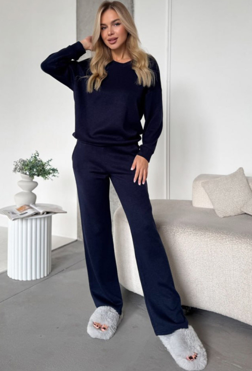 Теплый и комфортный женский костюм от украинского бренда Julia Ulich. Костюм выполнен из мягкой и качественной ангоры темно-синего цвета, состоит из кофты со штанами свободного силуэта. Кофта с длинными рукавами, заниженным плечевым швом и V-образным вырезом горла, на рукавах и внизу обработана манжетами. Штаны с мягкой резинкой в поясе и удобными боковыми карманами. Костюм очень красивый и приятный к телу, идеальный выбор для домашнего уюта и стиля, также может быть полезным подарком любимому и близкому человеку!