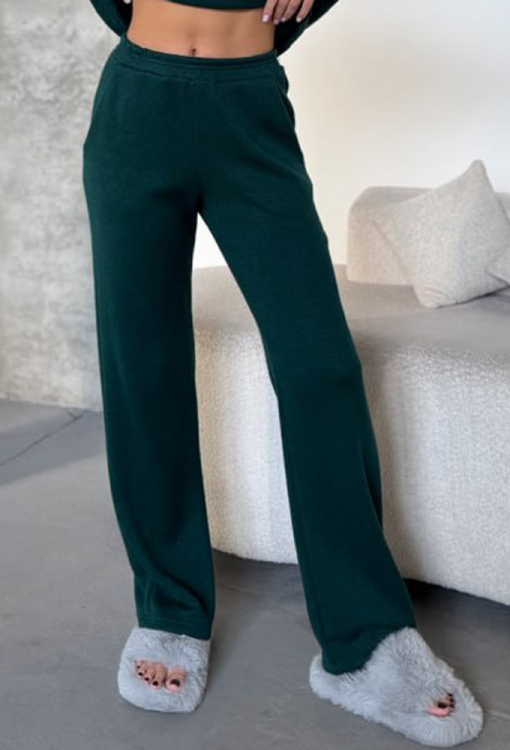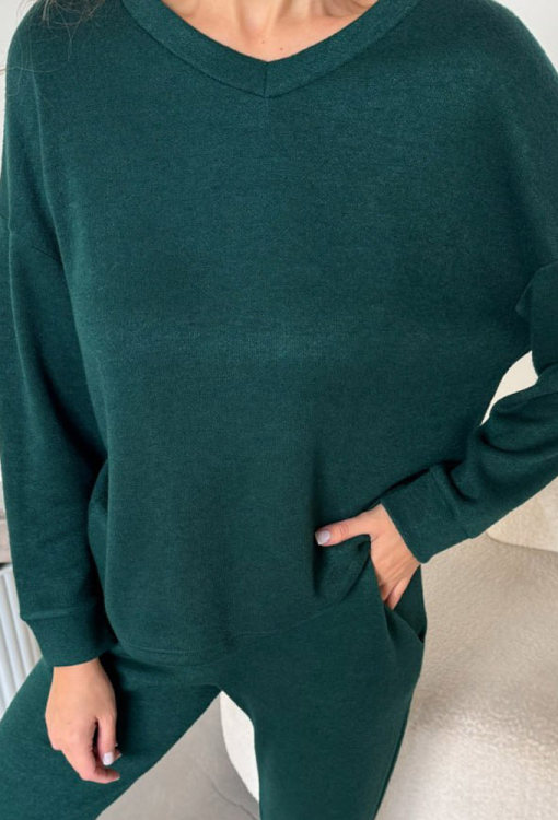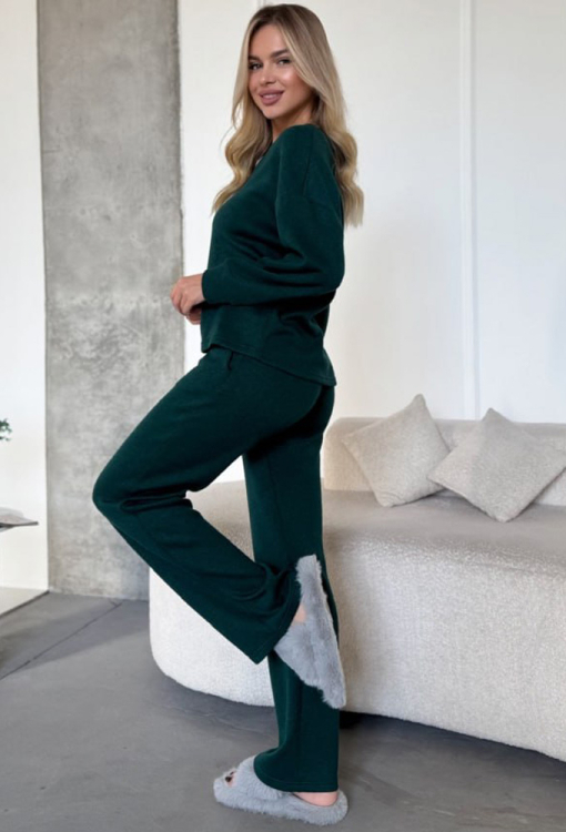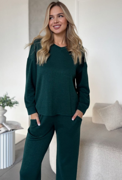 Теплый и комфортный женский костюм от украинского бренда Julia Ulich. Костюм выполнен из мягкой и качественной ангоры зеленого цвета, состоит из кофты со штанами свободного силуэта. Кофта с длинными рукавами, заниженным плечевым швом и V-образным вырезом горла, на рукавах обработана манжетами. Штаны с мягкой резинкой в поясе и удобными боковыми карманами. Костюм очень красивый и приятный к телу, идеальный выбор для домашнего уюта и стиля, также может быть полезным подарком любимому и близкому человеку!