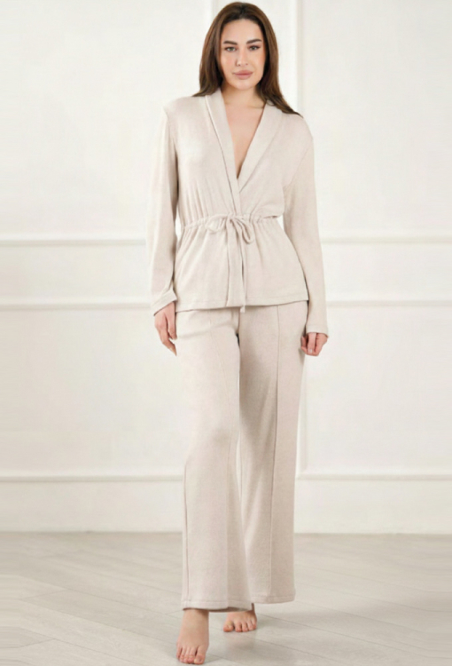 Элегантный женский костюм Lola от украинского бренда Komilfo - воплощение комфорта и домашнего стиля. Костюм выполнен из мягкой и качественной ангоры светло-бежевого цвета, состоит из рубашки прямого силуэта и штанов свободного кроя. Рубашка с длинными рукавами и воротником шаль, завязывается на запах с помощью тонкого внутреннего пояса, подчеркивая стройность фигуры. Штаны с мягкой резинкой в поясе и фиксированными стрелками, создают комфортную посадку не сковывают движений. Костюм очень красивый и удобный, идеален для домашнего отдыха в холодное время года, упакованный в фирменную коробку - отличный подарок близким людям!