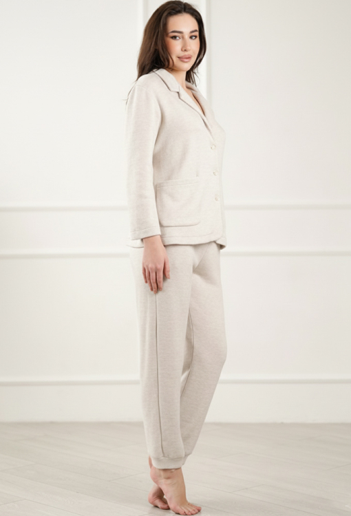 Элегантный женский костюм Olivia от украинского бренда Komilfo - воплощение комфорта и домашнего стиля. Костюм выполнен из мягкой и качественной ангоры светло-бежевого цвета, состоит из жакета прямого силуэта и штанов на манжетах. Жакет с длинными рукавами и отложным воротником, застегивается на пуговицы, внизу обработан двумя накладными карманами. Штаны с мягкой резинкой в поясе и удобными боковыми карманами, создают комфортную посадку не сковывают движений. Костюм очень красивый и стильный, идеален для домашнего отдыха в холодное время года, упакованный в фирменную коробку - отличный подарок близким людям!