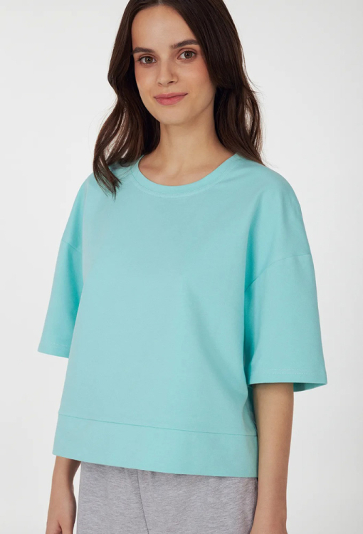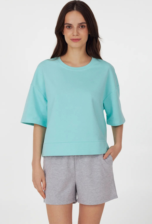 Легкий и приятный к телу женский костюм Amber от украинского бренда Ellen. Костюм выполнен из качественной и мягкого двунитки, состоит из футболки зеленого цвета и серых шорт. Футболка свободного кроя, с рукавами до локтя, приспущенным плечевым швом и круглым вырезом горла, низ обработан свободной манжетой. Шорты прямого кроя, с мягкой резинкой в поясе и удобными боковыми карманами. Костюм очень красивый и комфортный, будет отличной одеждой для дома или полезным подарком любимому и близкому человеку!