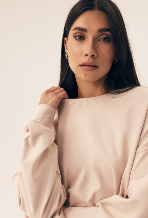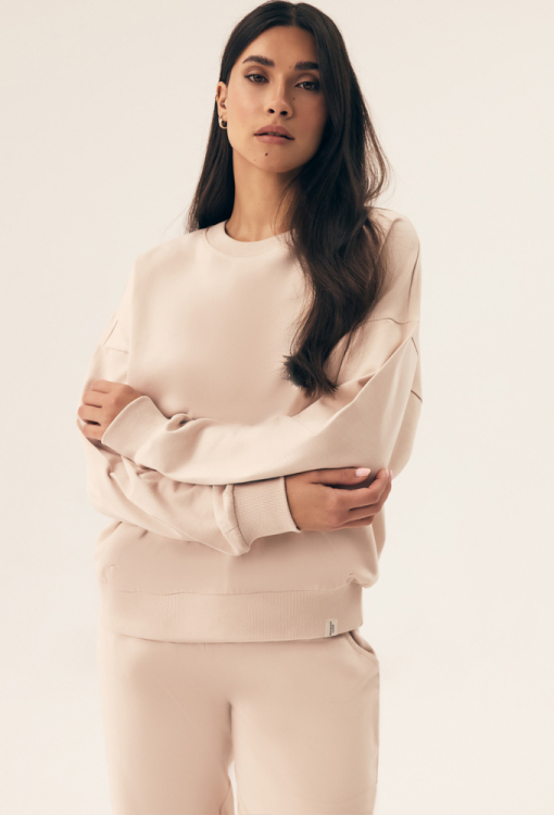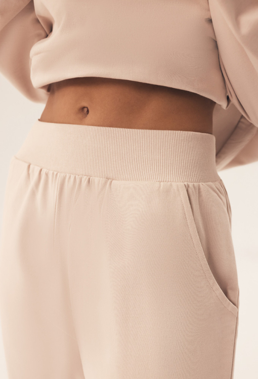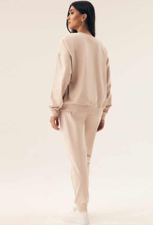 Комфортный женский костюм Belt от польского бренда Henderson Ladies. Костюм выполнен из мягкого и качественного хлопка бежевого цвета, состоит из кофты свободного кроя и штанов на манжетах. Кофта с длинными рукавами, заниженным плечевым швом и круглым вырезом горла, рукава, горловина и низ изделия обработаны трикотажными манжетами. Штаны с широким эластичным поясом и удобными боковыми карманами. Костюм очень красивый и комфортный, идеален для домашнего уюта в холодную пору, а также может быть полезным подарком любимому и близкому человеку.