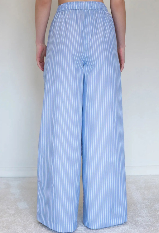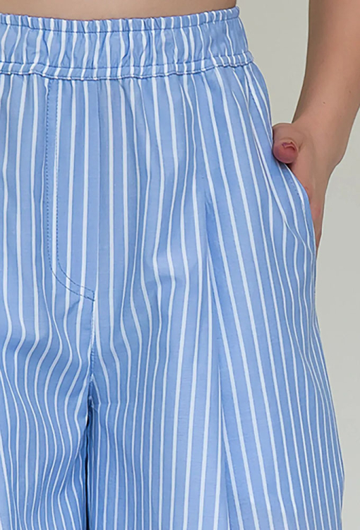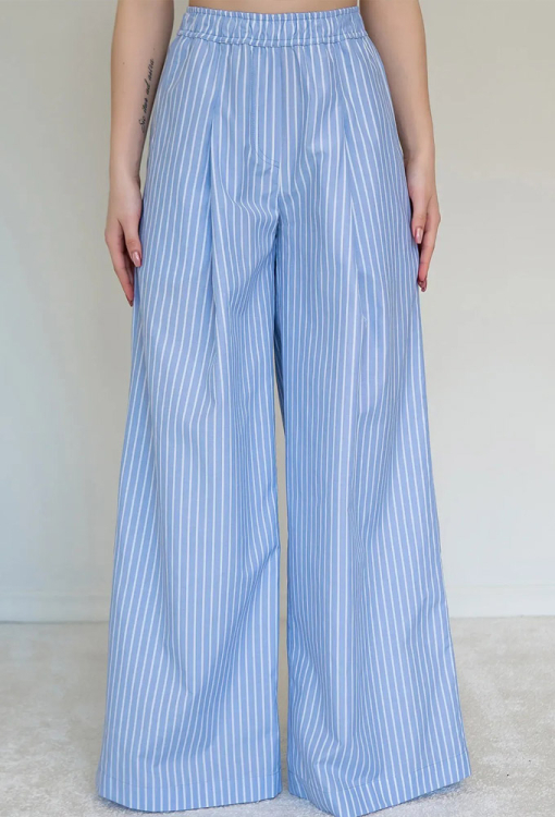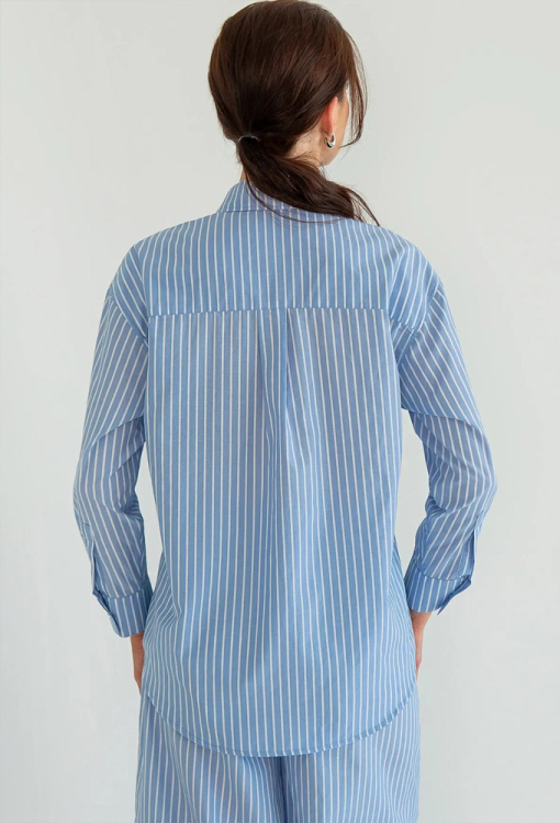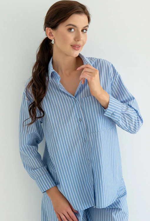 Стильный женский костюм Blue от украинского бренда Forly. Костюм выполнен из качественного и мягкого хлопка синего цвета в тонкую белую полоску, состоит из рубашки свободного силуэта и широких штанов. Рубашка с длинными рукавами на манжетах и отложным воротником, застегивается на пуговицы. На груди слева модель украшена накладным карманом, спинка обработаны кокеткой и продольной складкой. Штаны свободного кроя с мягкой резинкой в поясе и удобными боковыми карманами, спереди обработаны двумя небольшими складками прошитыми вверху. Костюм очень красивый и комфортный, идеален для уютного домашнего отдыха, а также может быть полезным подарком любимому и близкому человеку.