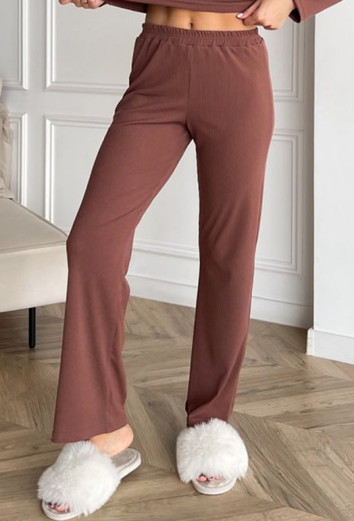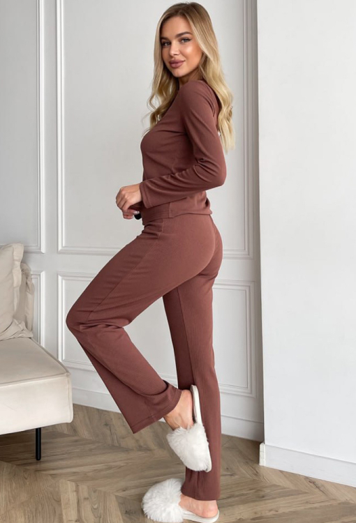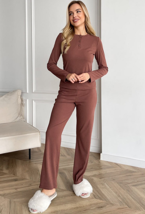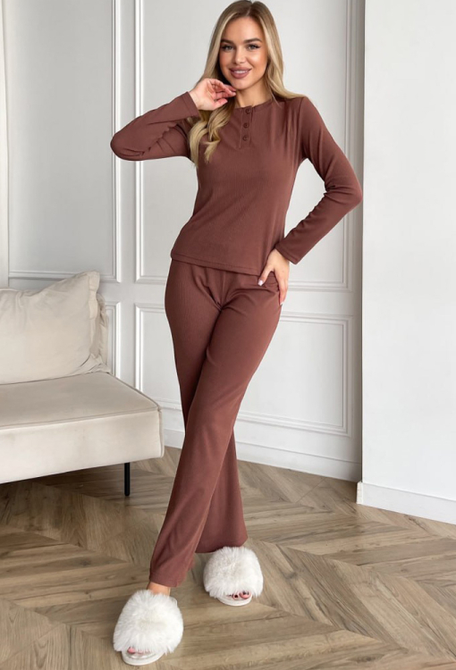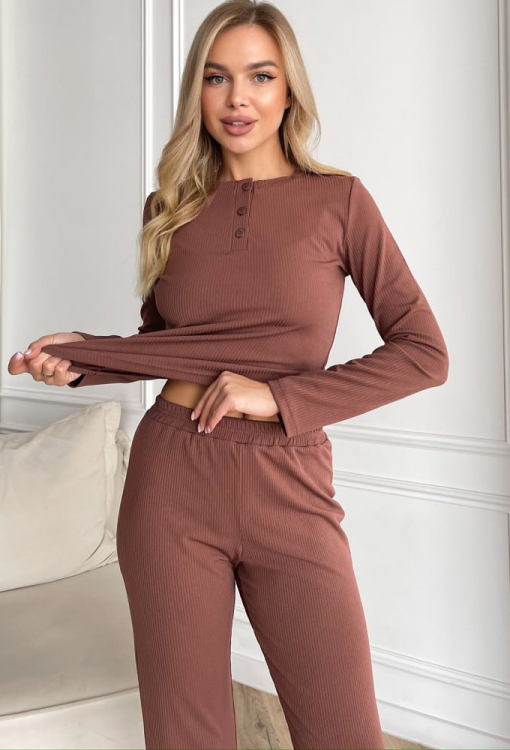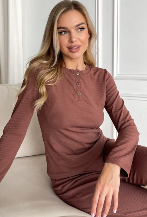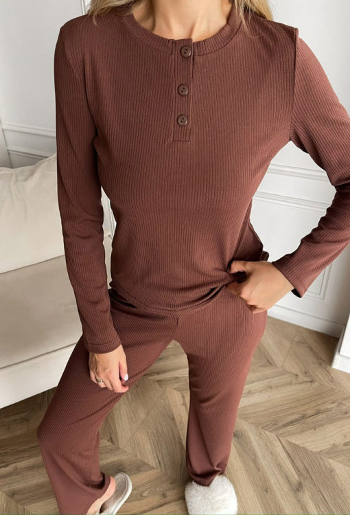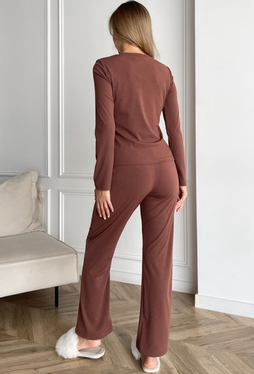 Комфортный женский костюм от украинского бренда Julia Ulich. Костюм выполнен из мягкого и качественного хлопка в рубчик шоколадного цвета, состоит из кофты прямого силуэта и штанов свободного кроя. Кофта с длинными рукавами и круглым вырезом горла, вверху застегивается на три пуговицы. Штаны с удобной посадкой и мягкой резинкой в поясе. Костюм очень красивый и приятный к телу, подчеркнет стиль и придаст уверенности домашнему образу, также может быть прекрасным подарком любимому и близкому человеку!