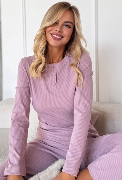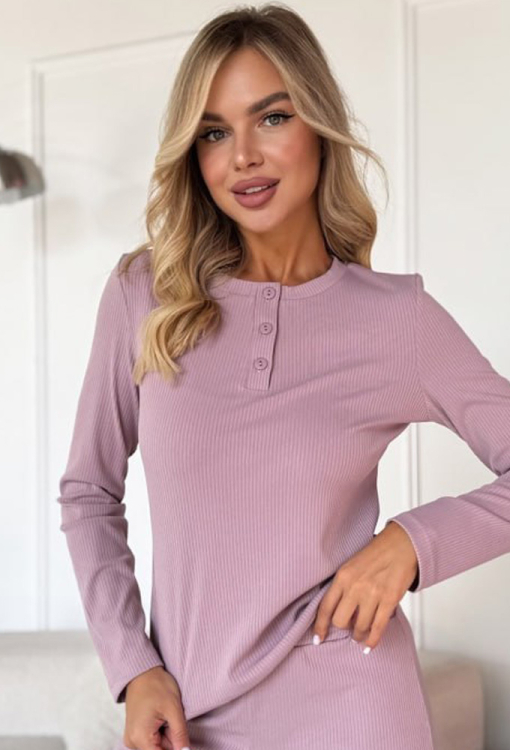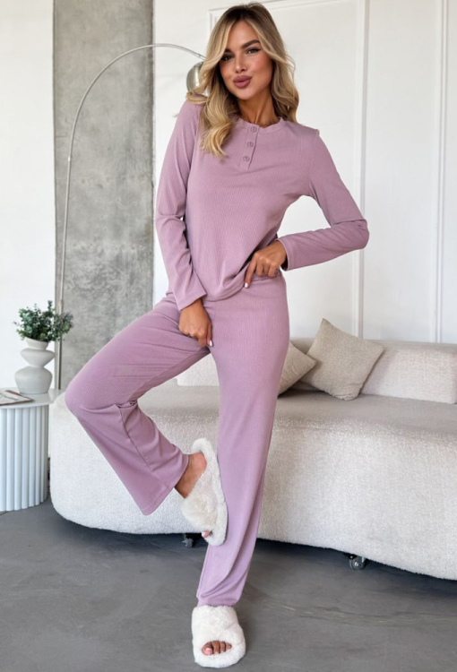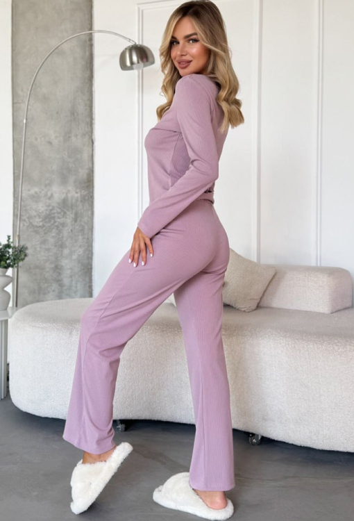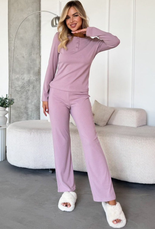 Комфортный женский костюм от украинского бренда Julia Ulich. Костюм выполнен из мягкого и качественного хлопка в рубчик пудрового цвета, состоит из кофты прямого силуэта и штанов свободного кроя. Кофта с длинными рукавами и круглым вырезом горла, вверху застегивается на три пуговицы. Штаны с удобной посадкой и мягкой резинкой в поясе. Костюм очень красивый и приятный к телу, подчеркнет стиль и придаст уверенности домашнему образу, также может быть прекрасным подарком любимому и близкому человеку!