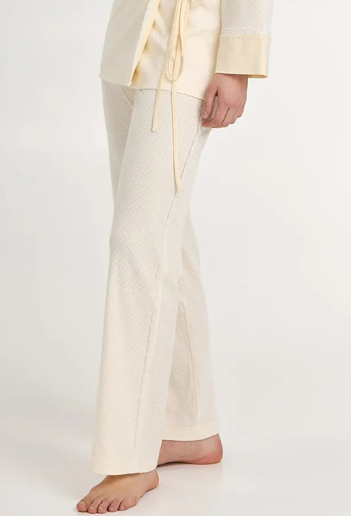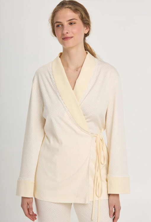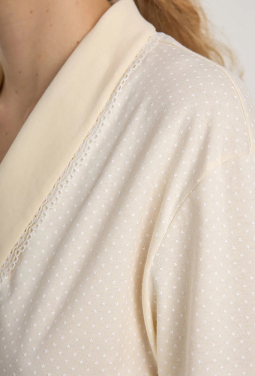 Элегантный женский костюм из коллекции French Vanila от украинского бренда Ellen. Костюм выполнен из качественного и мягкого модала, кремового цвета в мелкий принт в виде белых звездочек, состоит из жакета свободного силуэта и прямых штанов. Жакет с длинными рукавами и воротником шаль, завязывается на запах с помощью вшитых завязок. Воротник модели выполнен из однотонной ткани кремового цвета и украшен тонким белым кружевом, рукава обработаны свободными манжетами и кружевом в тон воротника Штаны с удобной посадкой и мягкой резинкой в поясе, по бокам украшены тонким белым кружевом. Костюм очень красивый и комфортный, будет отличной одеждой для дома или полезным подарком любимому и близкому человеку!