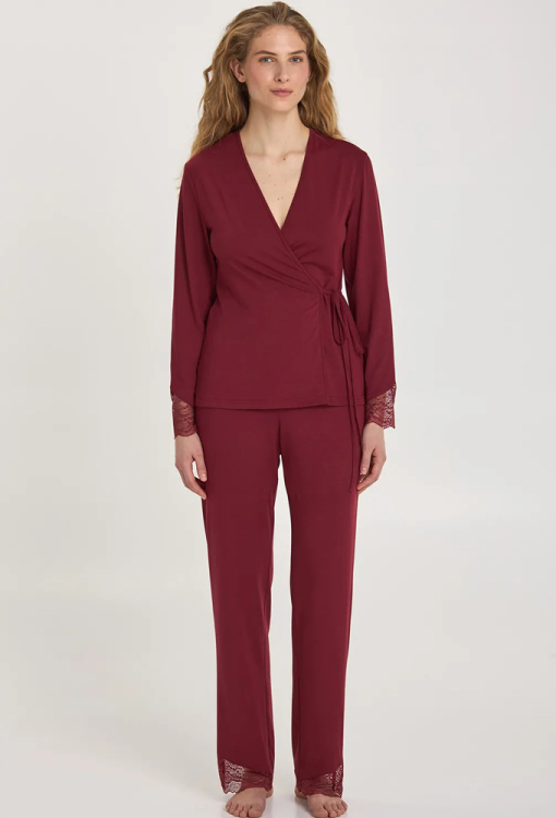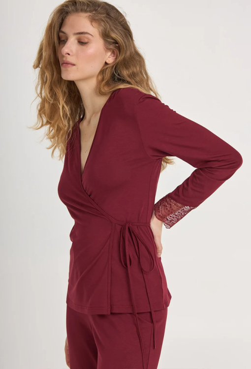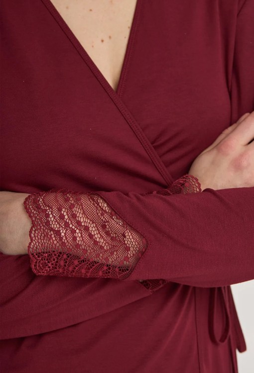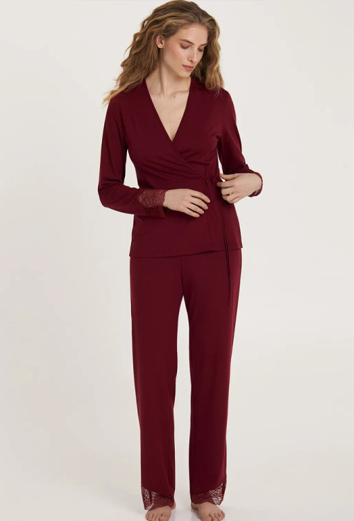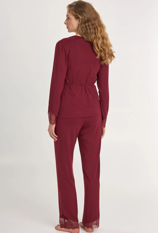 Элегантный женский костюм из коллекции Meryl от украинского бренда Ellen. Костюм выполнен из качественного и мягкого модала бордового цвета, состоит из жакета свободного силуэта и прямых штанов. Жакет с длинными рукавами завязывается на запах с помощью вшитых завязок и украшен кружевными вставками на рукавах. Штаны с удобной посадкой и мягкой резинкой в поясе, внизу украшены вставками из ажурного кружева. Костюм очень красивый и комфортный, будет отличной одеждой для дома или полезным подарком любимому и близкому человеку!