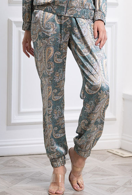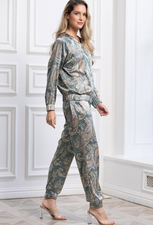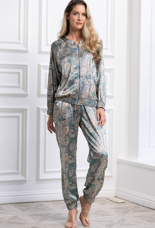 Стильный женский костюм из коллекции Donatella от итальянского бренда Mia-Amore. Костюм выполнен из смесового полотна на основе натурального шелка, зеленого цвета с бежевым принтом в восточном стиле, состоит из кофты и штанов. Кофта с длинными рукавами и круглым вырезом горла, застегивается на молнию. Рукава и низ модели обработаны эластичными манжетами. Штаны с мягкой резинкой в поясе и удобными боковыми карманами, внизу с манжетами. Костюм очень красивый и комфортный, придаст изюминки домашнему образу, также может быть отличным подарком близким людям!
