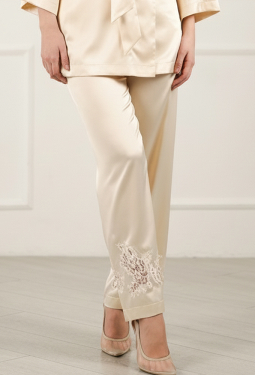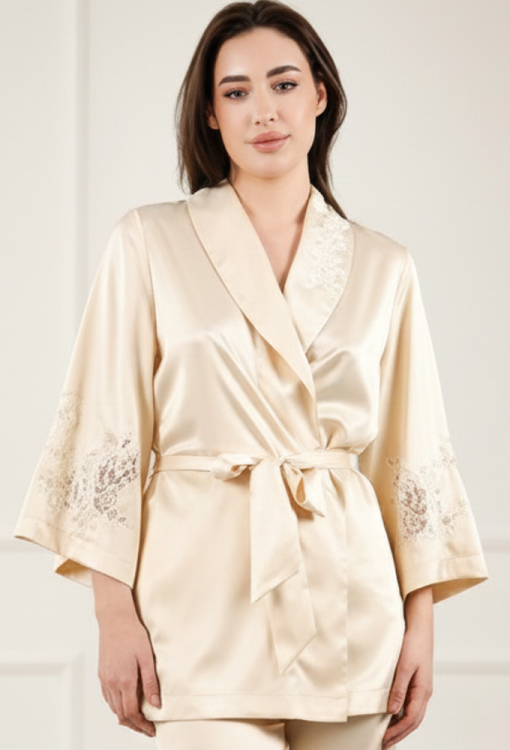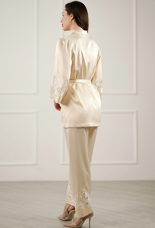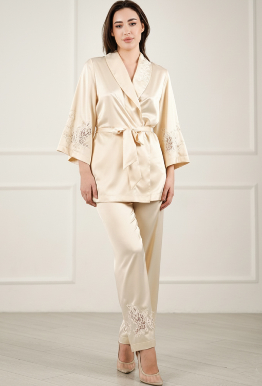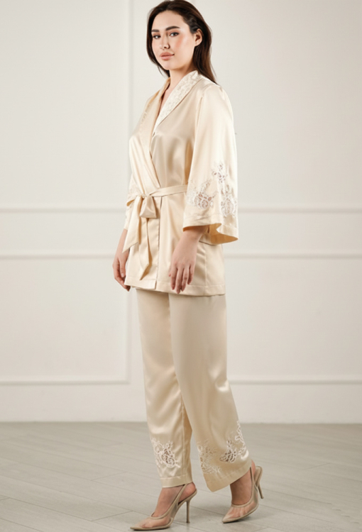 Шикарный женский костюм Citrine от украинского бренда Komilfo - воплощение элегантности и домашнего стиля. Костюм выполнен из мягкого и качественного вискозного шелка светло-бежевого цвета, состоит из короткого халата свободного силуэта и прямых штанов. Халат со слегка расширенными рукавами длиной 7/8 и шалевым воротником, завязывается на запах с помощью пояса, подчеркивая стройность фигуры. Рукава модели украшены вставками из ажурного кружева, воротник обработан кружевными аппликациями, что придает изящного акцента образу. Штаны с мягкой резинкой в поясе создают комфортную посадку, не стесняют движений, внизу украшены вырезными кружевными вставками. Костюм очень красивый и удобный, идеален для домашнего отдыха, упакованный в фирменную коробку - отличный подарок близким людям!