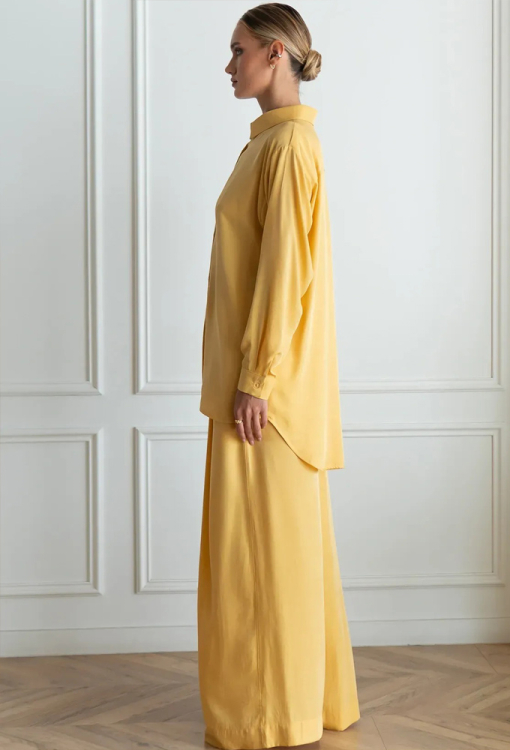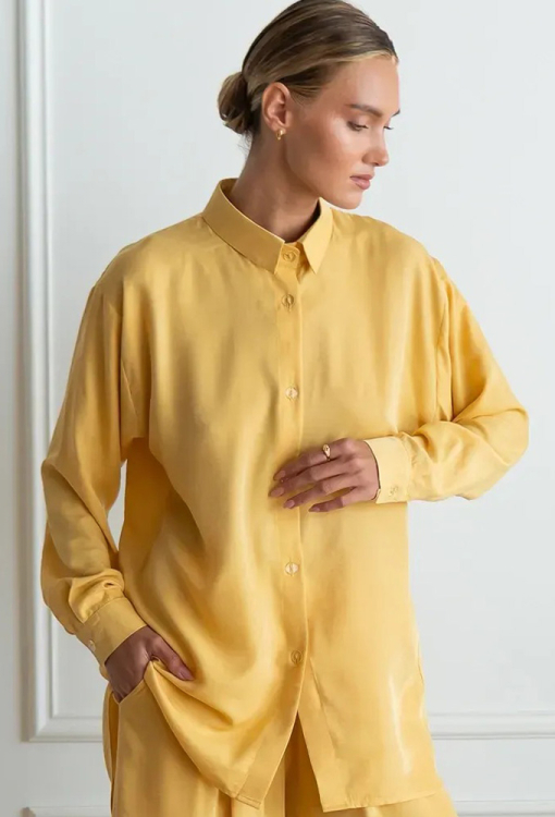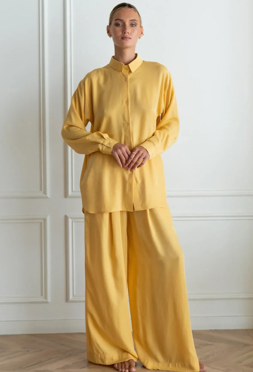 Стильный женский костюм Lemon от украинского бренда Forly. Костюм выполнен из качественного и мягкого искусственного шелка желтого цвета, состоит из рубашки со штанами свободного кроя. Рубашка с длинными рукавами и отложным воротником, застегивается на пуговицы. Удлиненная спинка модели обработана кокеткой и продольной складкой, рукава - манжетами на пуговицах. Штаны с мягкой резинкой в поясе и удобными боковыми карманами, спереди обработаны небольшими складками прошитыми вверху. Костюм очень красивый и комфортный, идеален для уютного домашнего отдыха, а также может быть полезным подарком любимому и близкому человеку.