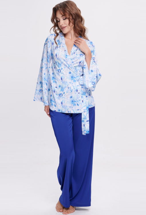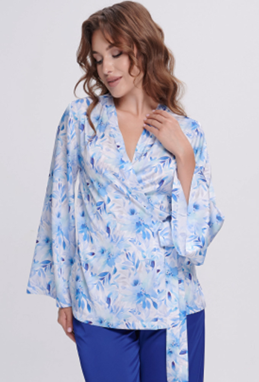 Стильный женский костюм от украинского бренда Shato. Костюм выполнен из качественного и мягкого шелка Армани, состоит из рубашки белого цвета в синий цветочный принт и штанов синего цвета. Рубашка свободного силуэта и с расширенными длинными рукавами, завязывается на запах с помощью пояса. Штаны также свободного кроя с удобной посадкой и мягкой резинкой в поясе. Костюм очень красивый и комфортный, способен поднять настроение и создать уют в домашней обстановке, отличный подарок для любимого или близкого человека.