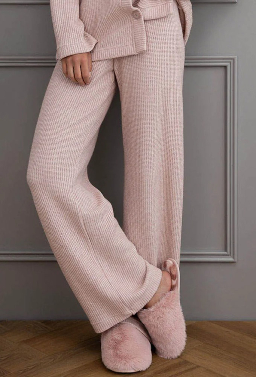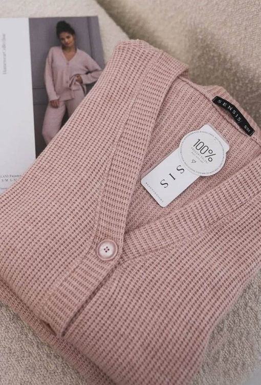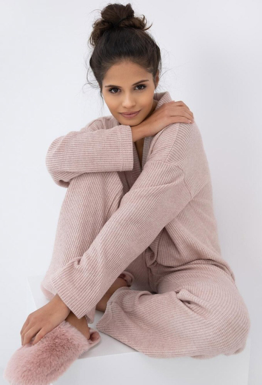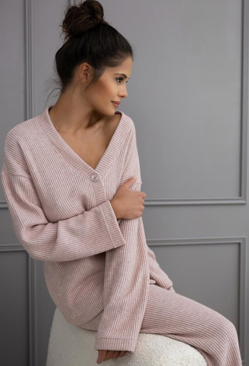 Модный женский костюм Alani от польского бренда Sensis. Костюм выполнен из качественного и мягкого трикотажа с вязанной фактурой пудрового цвета, состоит из рубашки свободного силуэта и штанов прямого кроя. Рубашка с длинными рукавами, заниженным плечевым швом и V-образным вырезом горла, застегивается на пуговицы. Штаны с мягкой резинкой в поясе, обеспечивают свободу движений и создают удобную посадку. Комплект очень красивый и комфортный, идеален для домашнего уюта, а также может быть замечательным подарком любимому и близкому человеку.