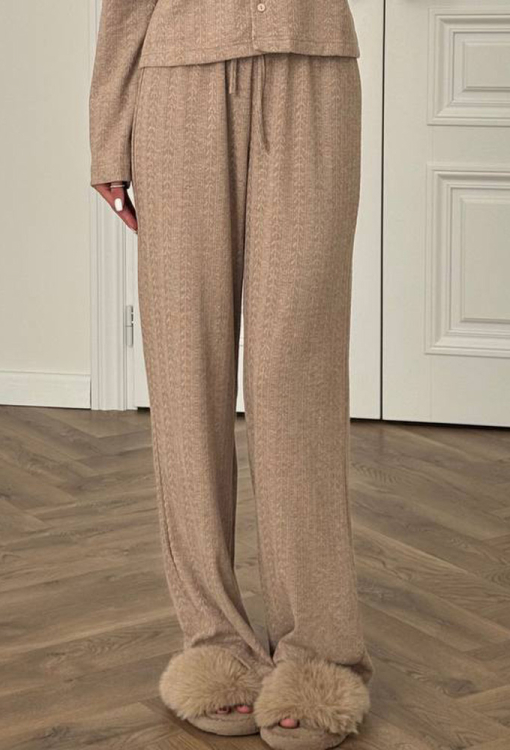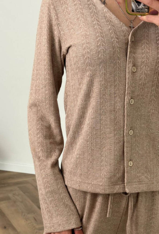 Стильный женский костюм от украинского бренда V.Velika. Костюм выполнен из мягкого и качественного трикотажа с фактурой "косичка" цвета капучино, состоит из кофты прямого силуэта и штанов свободного кроя. Кофта с длинными рукавами и V-образным вырезом горла, застегивается на пуговицы. Штаны с высокой посадкой и мягкой резинкой в поясе, регулируются по ширине с помощью внутреннего шнурка. Костюм очень красивый и невероятно комфортный, идеален для зимних домашних вечеров или подарка любиму и близкому человеку.