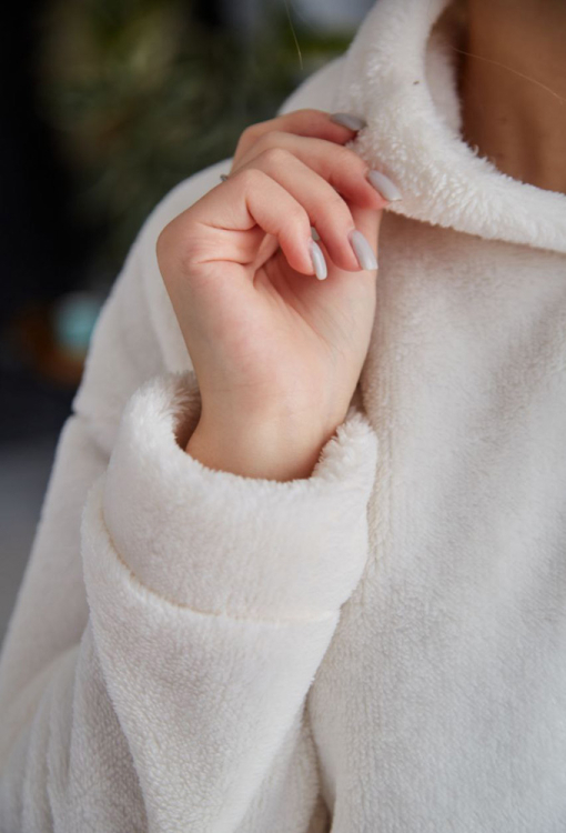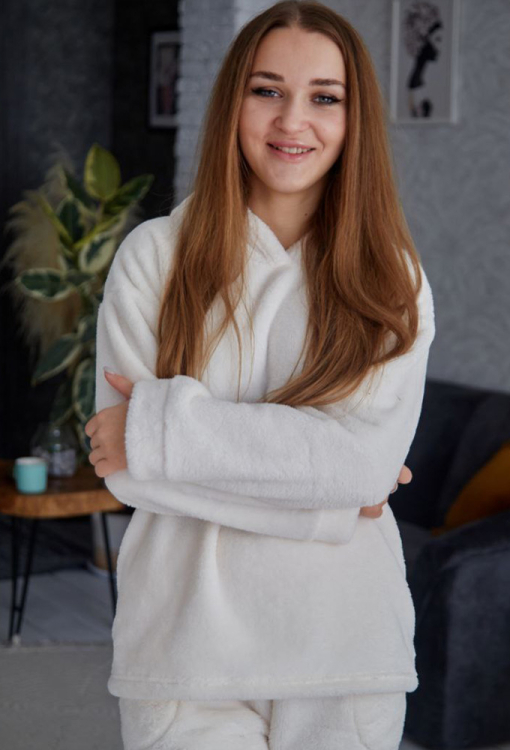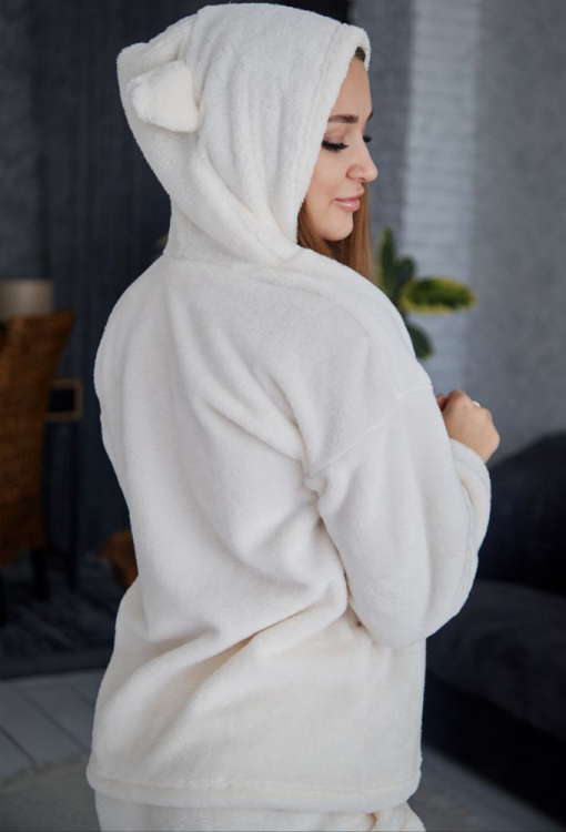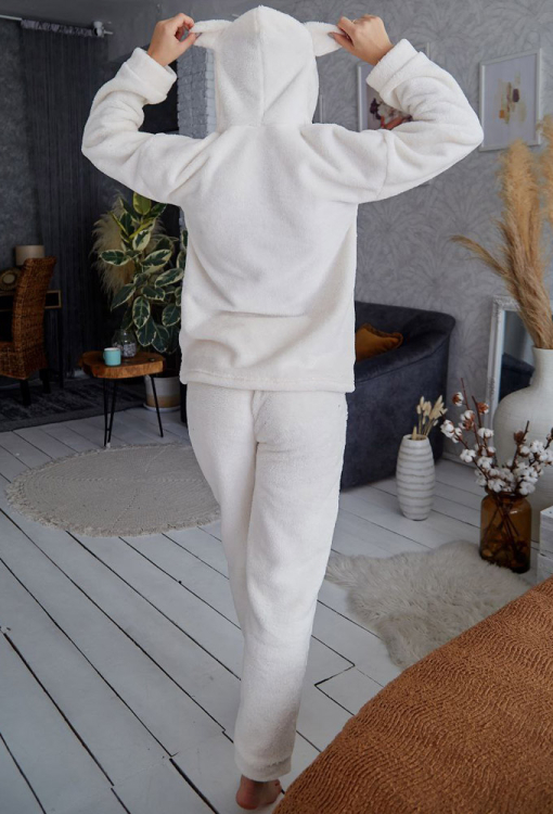 Стильный женский костюм от украинского бренда Tomiko. Костюм выполнена из мягкого и качественного велсофта кремового цвета, состоит из кофты и штанов прямого кроя. Кофта с длинными рукавами, заниженным плечевым швом и капюшоном, рукава модели обработаны свободными манжетами, капюшон украшен забавными ушками. Штаны с мягкой резинкой в поясе и свободными манжетами, по бокам расположены удобные карманы. Костюм красивый и уютный, приятно согревает и позволяет расслабиться после насыщенного дня, также может быть замечательным подарком близким людям.