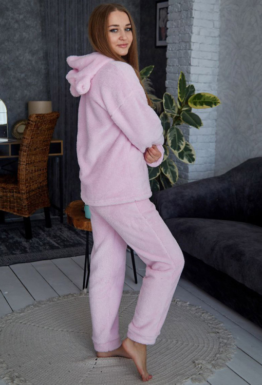Стильный женский костюм от украинского бренда Tomiko. Костюм выполнена из мягкого и качественного велсофта розового цвета, состоит из кофты и штанов прямого кроя. Кофта с длинными рукавами, заниженным плечевым швом и капюшоном, рукава модели обработаны свободными манжетами, капюшон украшен забавными ушками. Штаны с мягкой резинкой в поясе и свободными манжетами, по бокам расположены удобные карманы. Костюм красивый и уютный, приятно согревает и позволяет расслабиться после насыщенного дня, также может быть замечательным подарком близким людям.