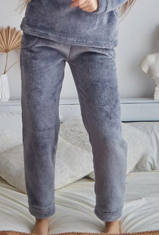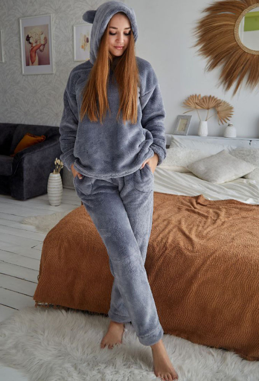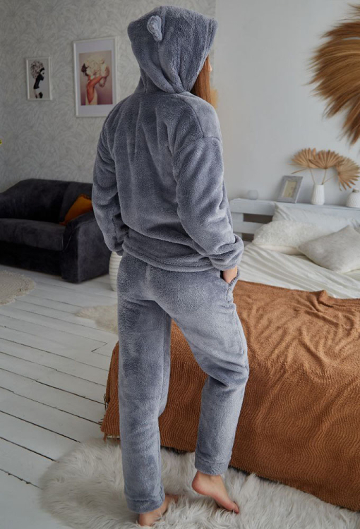 Стильный женский костюм от украинского бренда Tomiko. Костюм выполнена из мягкого и качественного велсофта серого цвета, состоит из кофты и штанов прямого кроя. Кофта с длинными рукавами, заниженным плечевым швом и капюшоном, рукава модели обработаны свободными манжетами, капюшон украшен забавными ушками. Штаны с мягкой резинкой в поясе и свободными манжетами, по бокам расположены удобные карманы. Костюм красивый и уютный, приятно согревает и позволяет расслабиться после насыщенного дня, также может быть замечательным подарком близким людям.