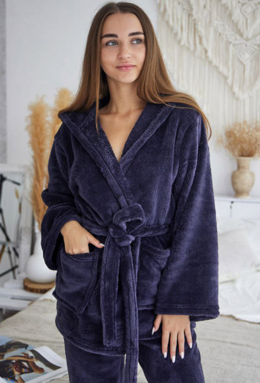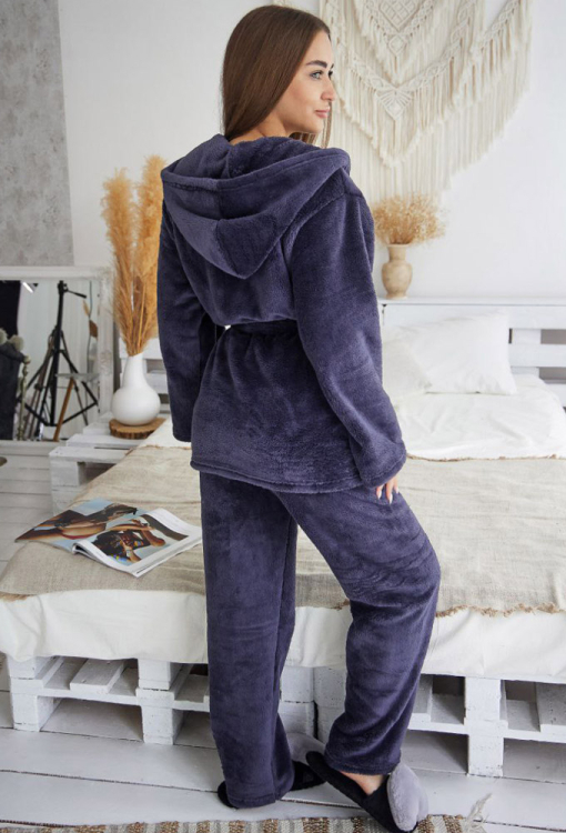 Теплый женский костюм от украинского бренда Tomiko. Костюм выполнена из мягкого и качественного велсофта графитового цвета, состоит из халата длиной мини и штанов прямого кроя. Халат с длинными рукавами, капюшоном и двумя накладными карманами, завязывается на запах с помощью пояса. Штаны с мягкой резинкой в поясе, создают комфортную посадку и не сковывают движений. Костюм стильный и уютный, приятно согревает и позволяет расслабиться после насыщенного дня, также может быть замечательным подарком близким людям.