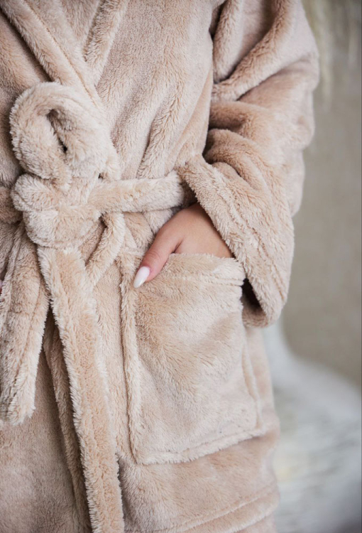 Теплый женский костюм от украинского бренда Tomiko. Костюм выполнена из мягкого и качественного велсофта цвета капучино, состоит из халата длиной мини и штанов прямого кроя. Халат с длинными рукавами, капюшоном и двумя накладными карманами, завязывается на запах с помощью пояса. Штаны с мягкой резинкой в поясе, создают комфортную посадку и не сковывают движений. Костюм стильный и уютный, приятно согревает и позволяет расслабиться после насыщенного дня, также может быть замечательным подарком близким людям.