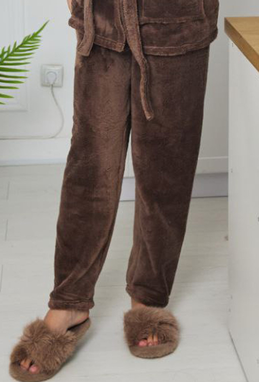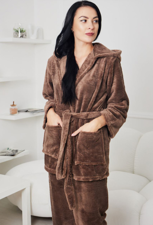Теплый женский костюм от украинского бренда Tomiko. Костюм выполнена из мягкого и качественного велсофта шоколадного цвета, состоит из халата длиной мини и штанов прямого кроя. Халат с длинными рукавами, капюшоном и двумя накладными карманами, завязывается на запах с помощью пояса. Штаны с мягкой резинкой в поясе, создают комфортную посадку и не сковывают движений. Костюм стильный и уютный, приятно согревает и позволяет расслабиться после насыщенного дня, также может быть замечательным подарком близким людям.