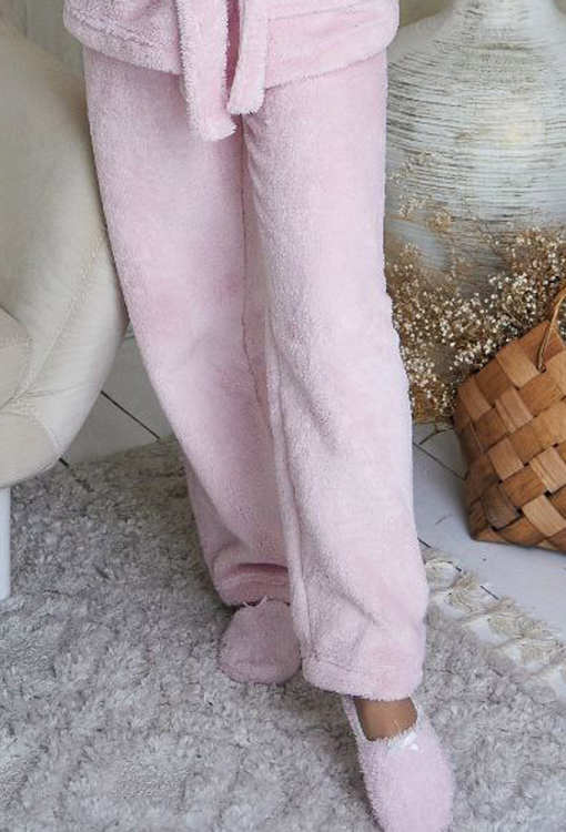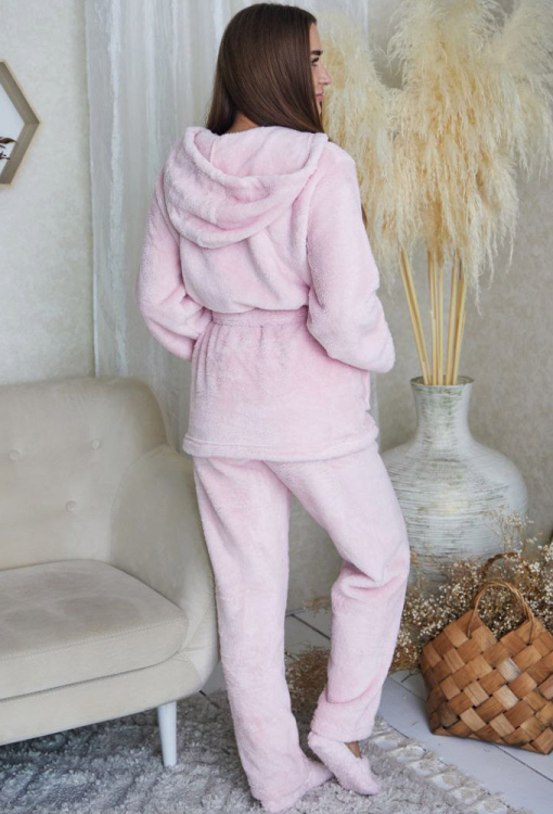 Теплый женский костюм от украинского бренда Tomiko. Костюм выполнена из мягкого и качественного велсофта пудрового цвета, состоит из халата длиной мини и штанов прямого кроя. Халат с длинными рукавами, капюшоном и двумя накладными карманами, завязывается на запах с помощью пояса. Штаны с мягкой резинкой в поясе, создают комфортную посадку и не сковывают движений. Костюм стильный и уютный, приятно согревает и позволяет расслабиться после насыщенного дня, также может быть замечательным подарком близким людям.