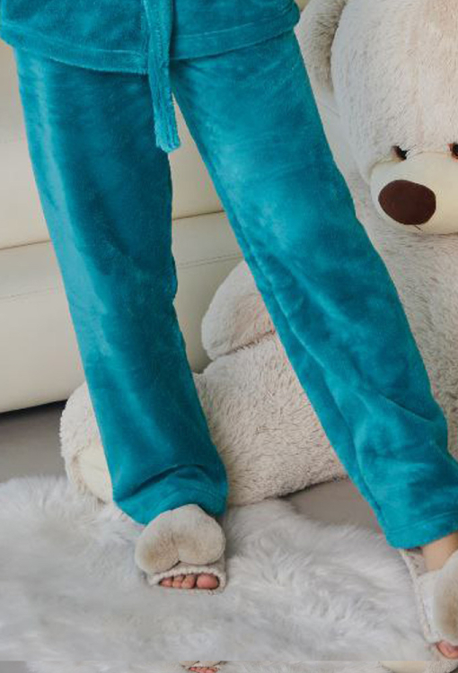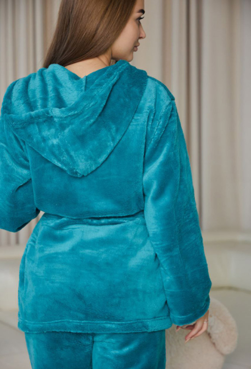 Теплый женский костюм от украинского бренда Tomiko. Костюм выполнена из мягкого и качественного велсофта бирюзового цвета, состоит из халата длиной мини и штанов прямого кроя. Халат с длинными рукавами, капюшоном и двумя накладными карманами, завязывается на запах с помощью пояса. Штаны с мягкой резинкой в поясе, создают комфортную посадку и не сковывают движений. Костюм стильный и уютный, приятно согревает и позволяет расслабиться после насыщенного дня, также может быть замечательным подарком близким людям.